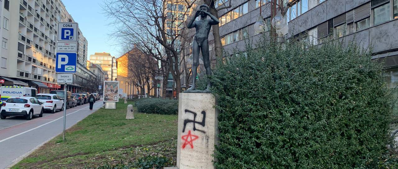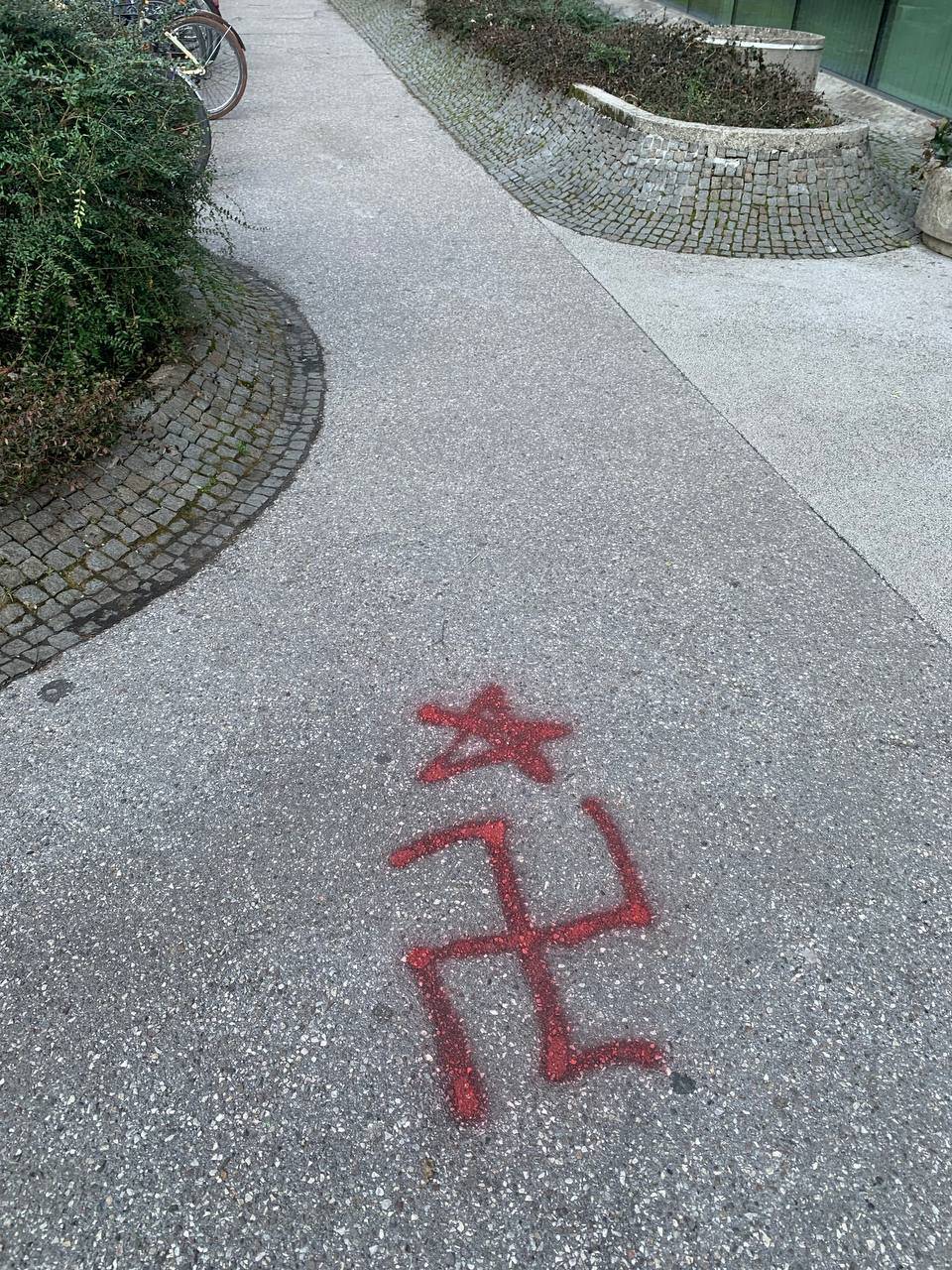 A Dečka s piščalko ni »doletela« le vrečka s smetmi: podstavek, na katerem stoji, je nekdo porisal s kljukastim križem in rdečo zvezdo. Oba simbola smo opazili tudi na asfaltu v bližini.
