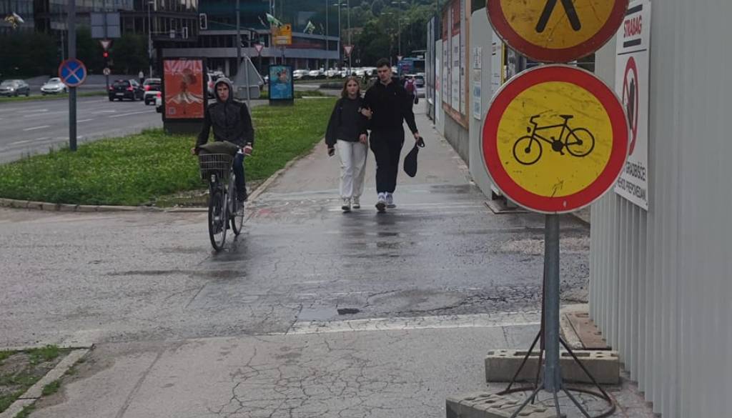 Ljubljanska kolesarska mreža je opozorila na znak za prepoved prometa pešcev in kolesarjev mimo vhoda v gradbišče, kjer nastaja Emonika, na Trgu Osvobodilne fronte.