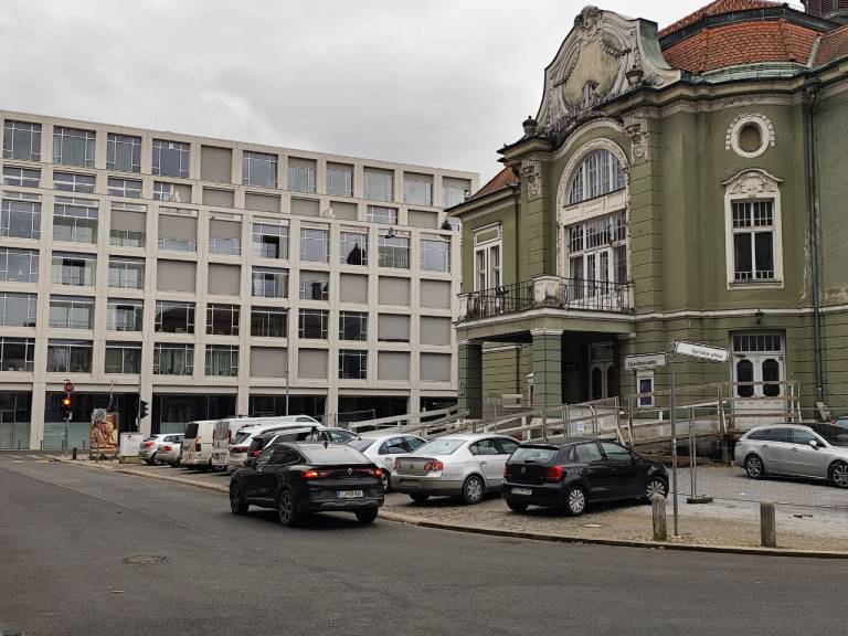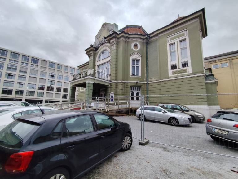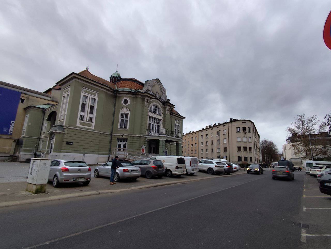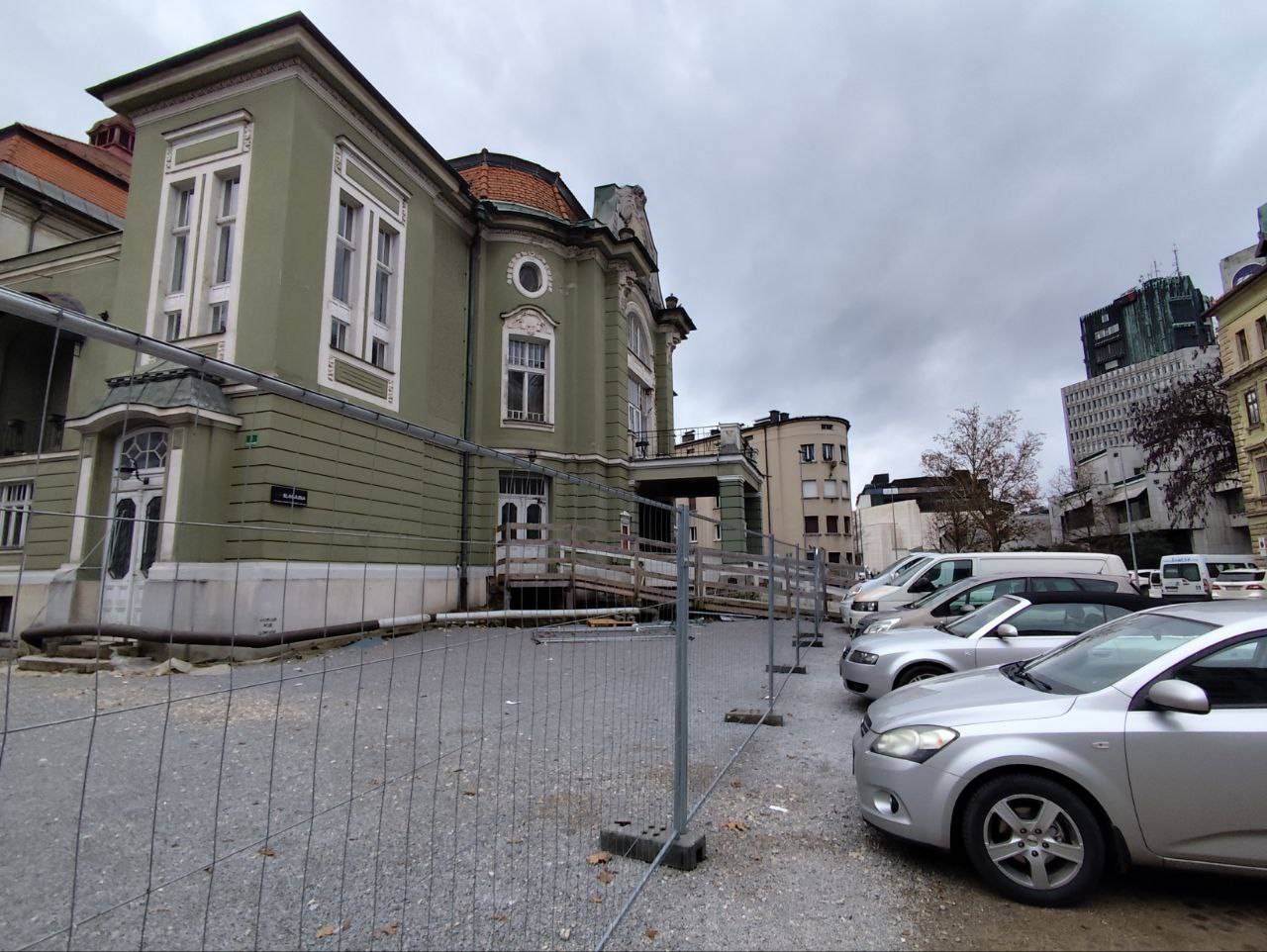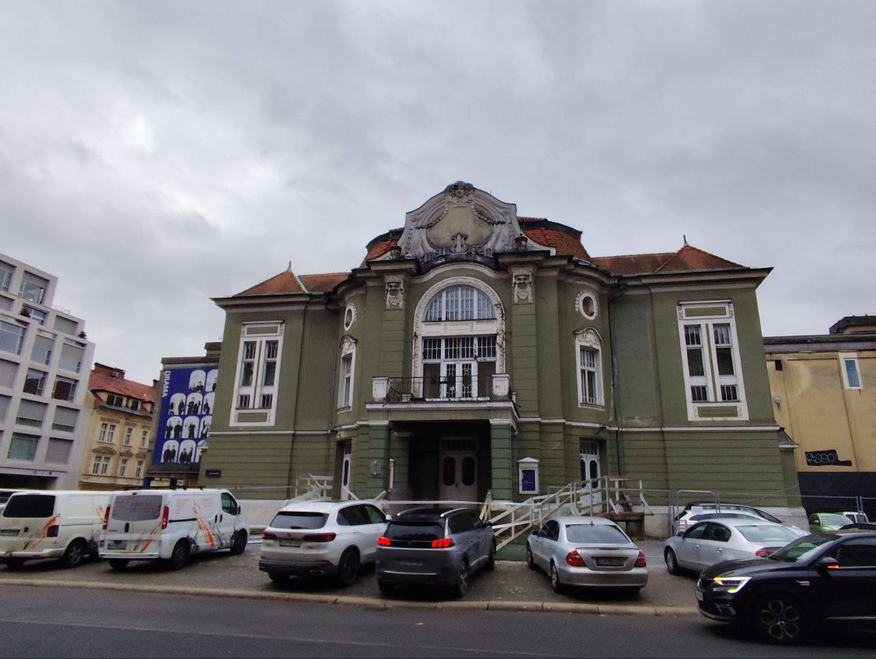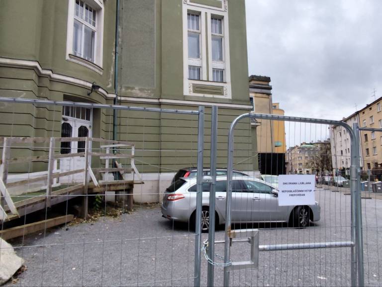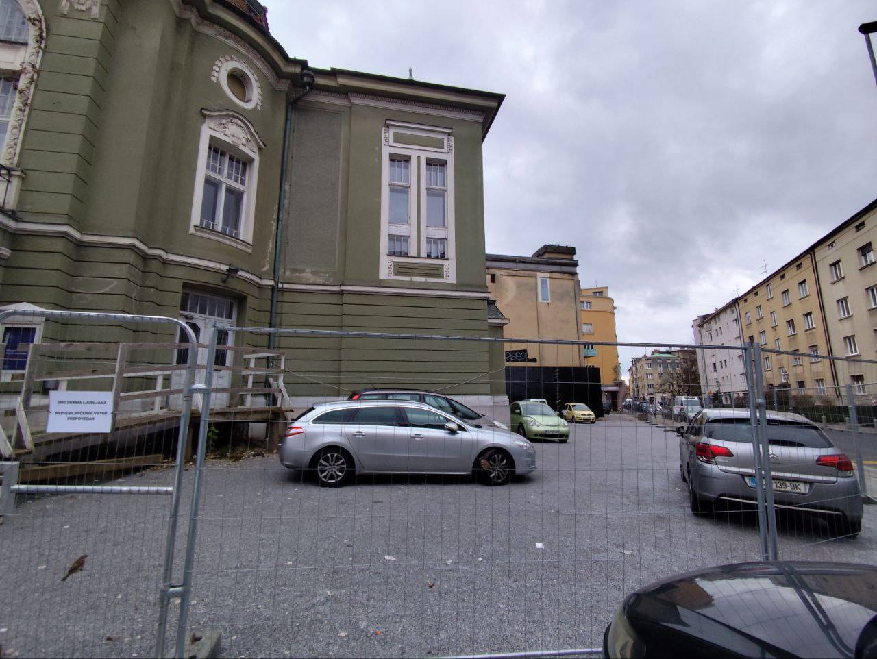 Okoli stavbe je postavljena jeklena ograja, pred njo pa na gosto parkirani avtomobili. Eden prav pred stopnicami vhoda v Dramo.
