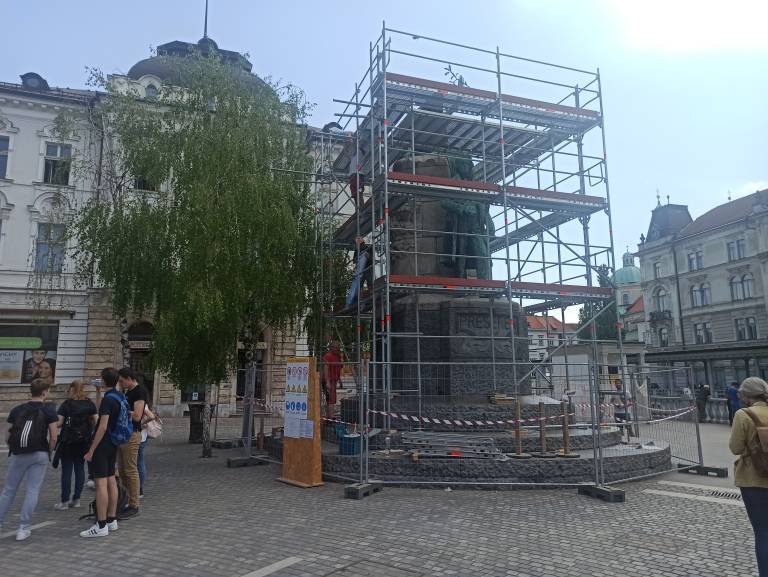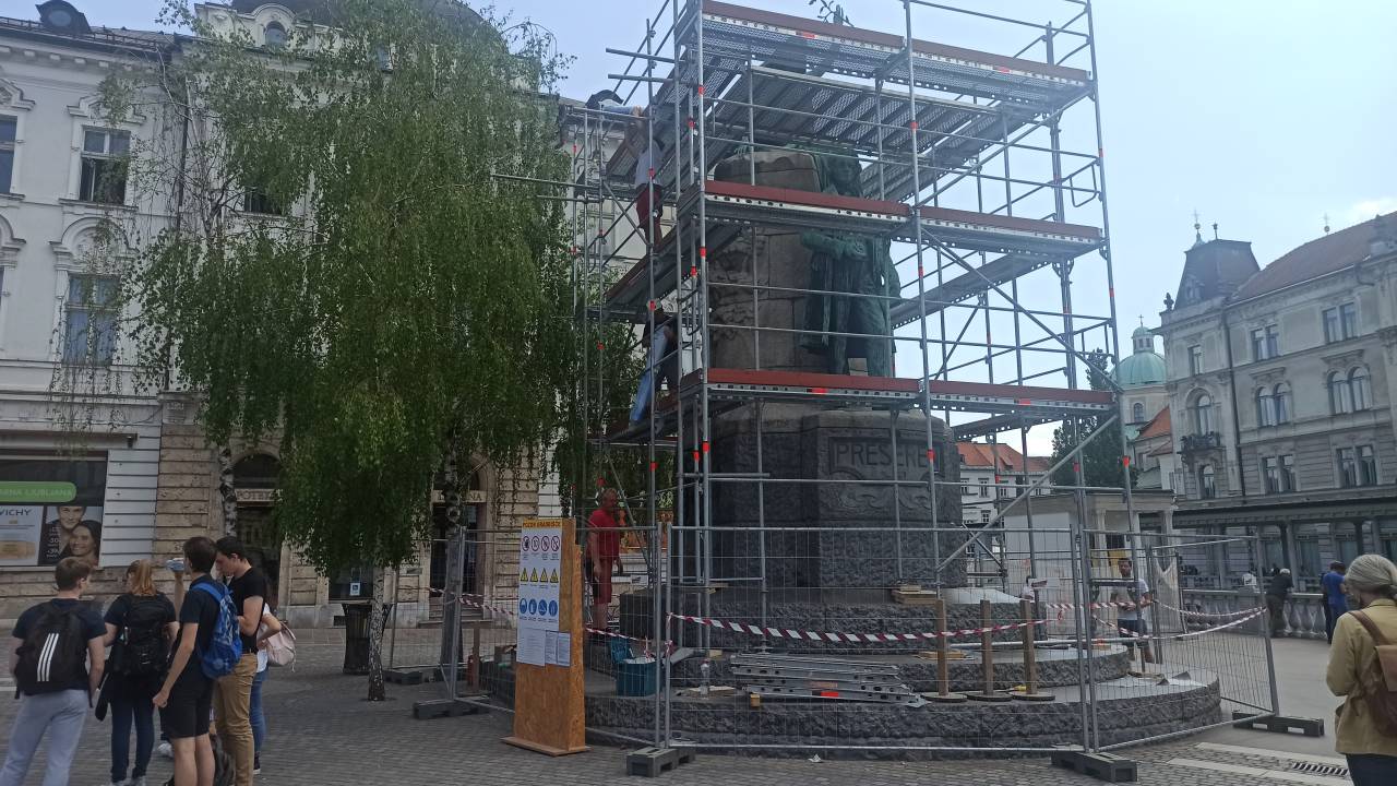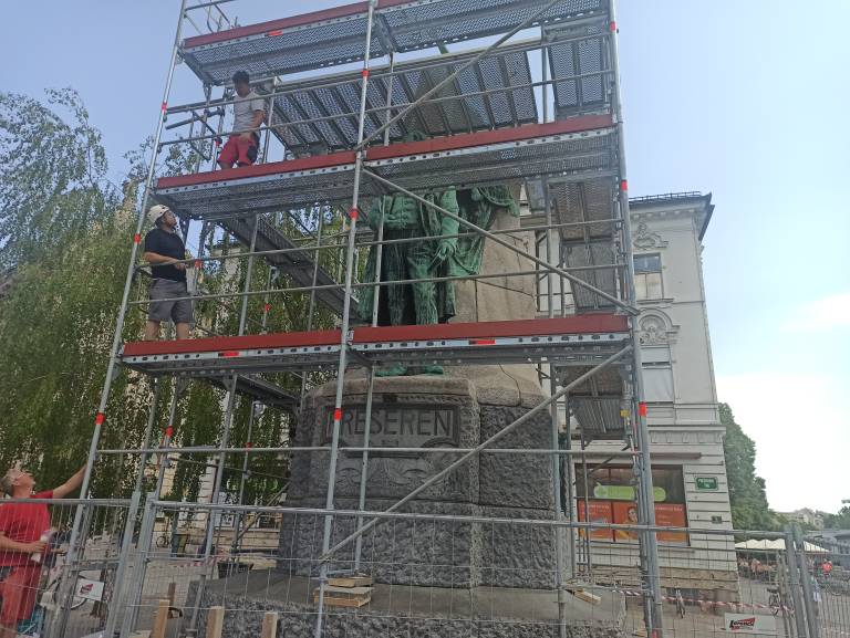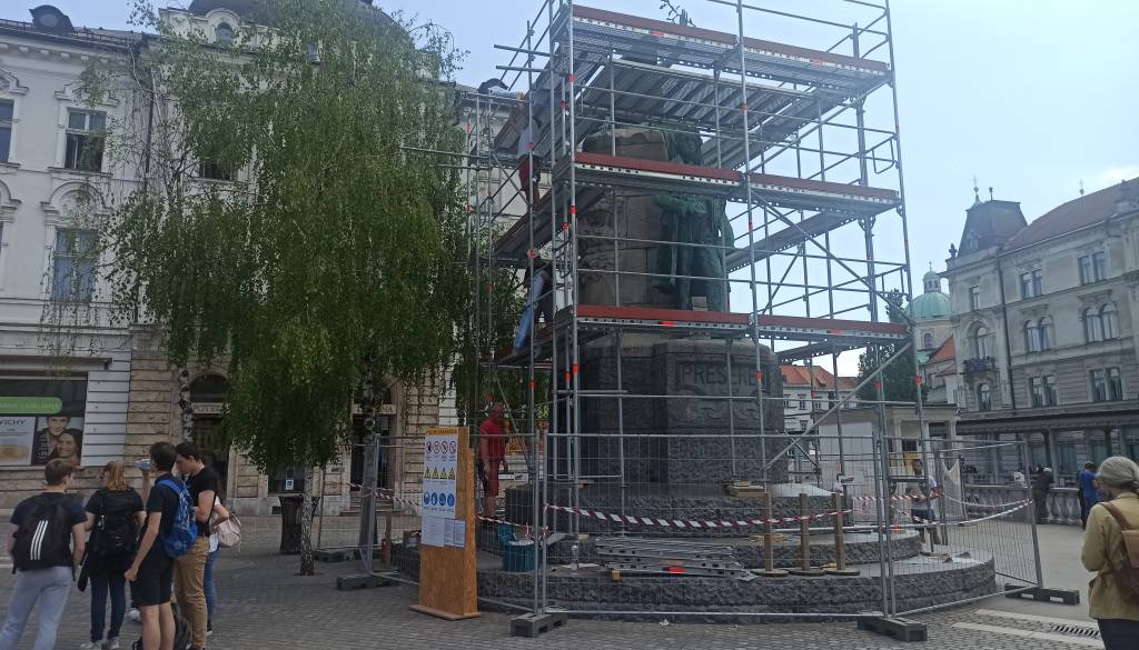 Če ste se danes sprehodili čez Prešernov trg, ste naleteli na nenavaden prizor. Okoli prešernovega spomenika je postavljen gradbeni oder.