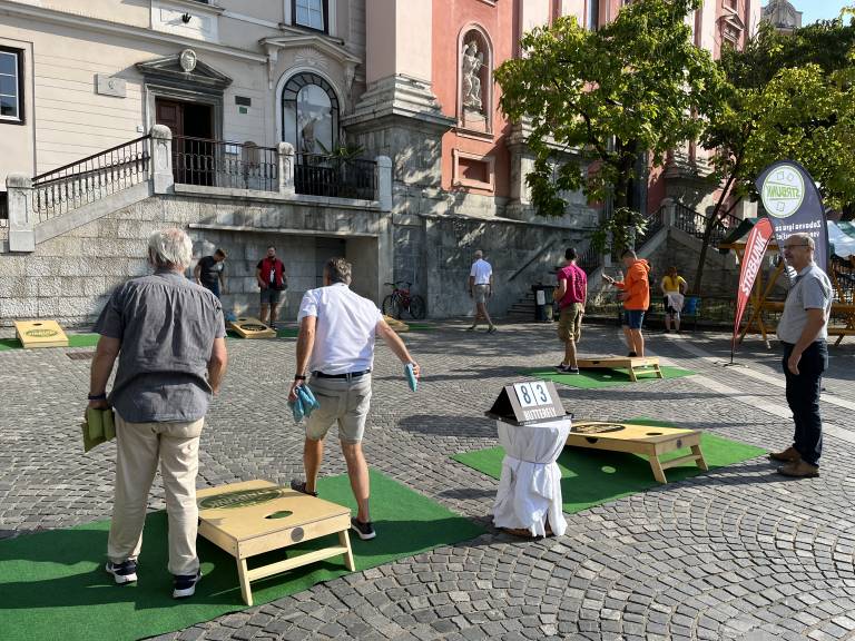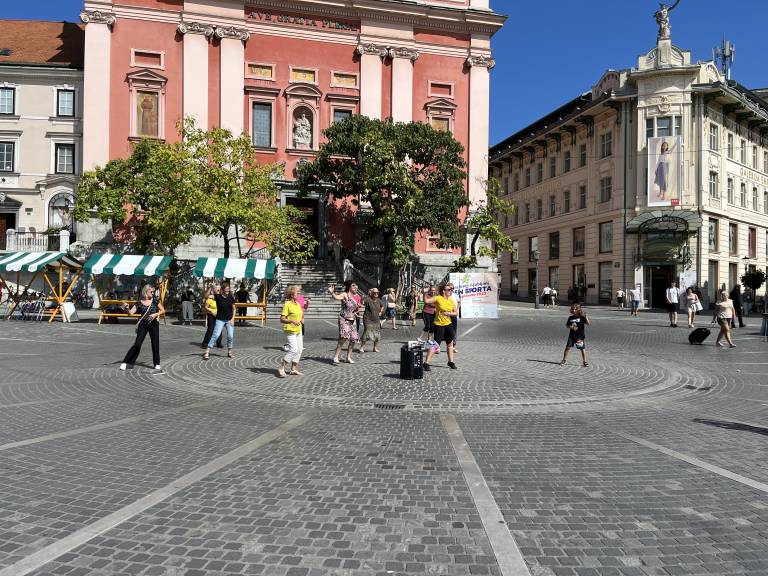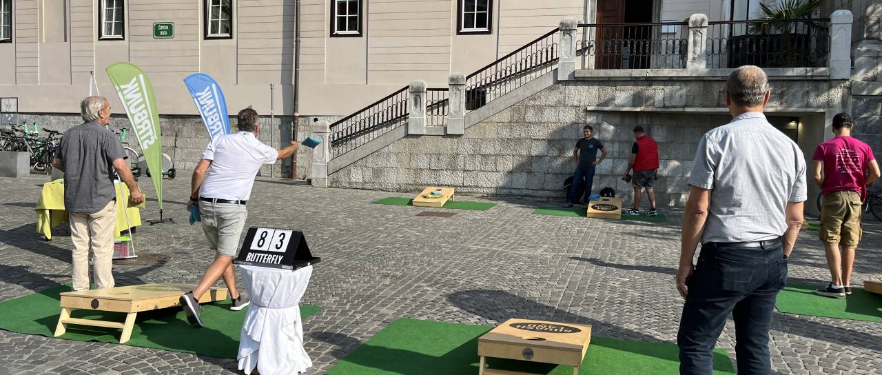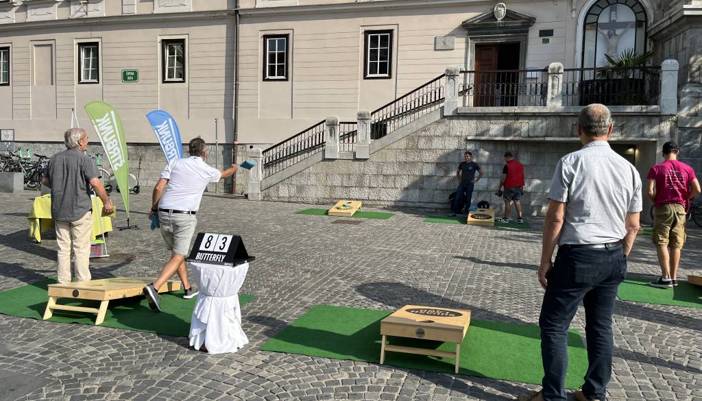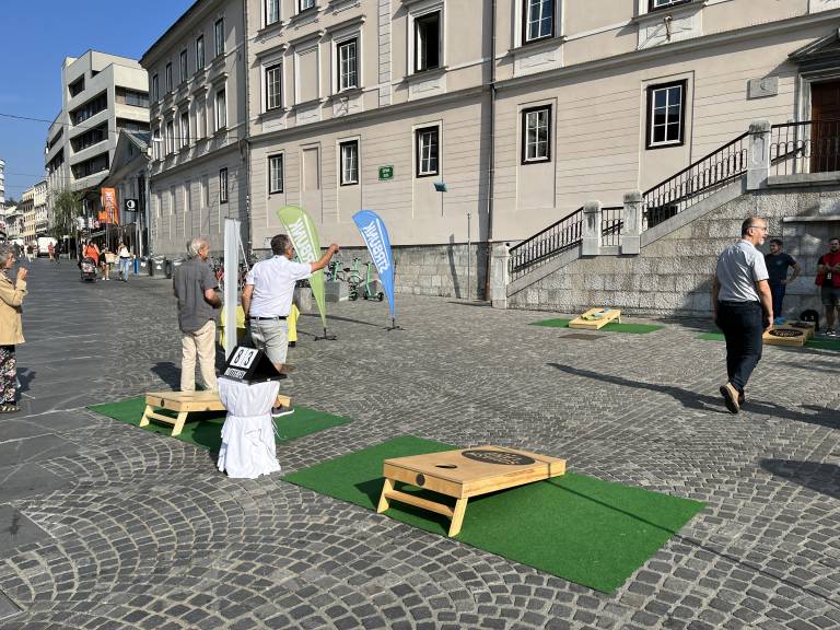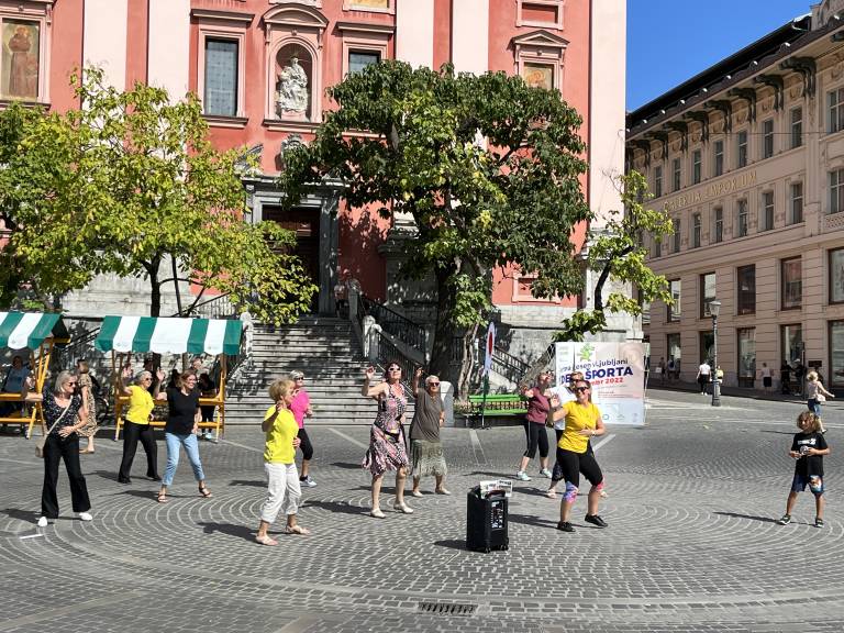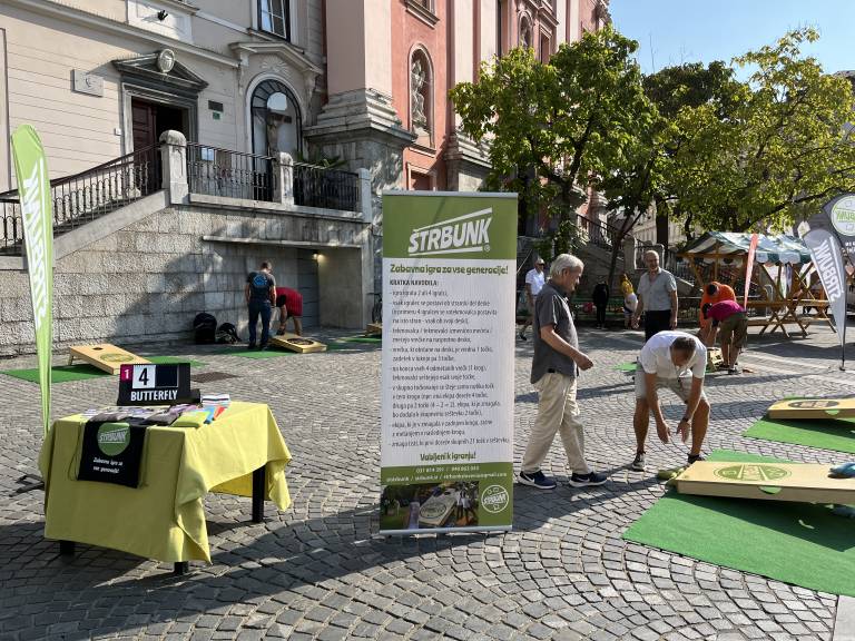 Mimoidoči so danes na Prešernovem trgu opazili, da je dogajanje bolj pestro kot običajno. Na delu ob cerkvi so zbrani igrali igro, imenovano Štrbunk, na sredini trga pa so starejši zaplesali v latino ritmih.