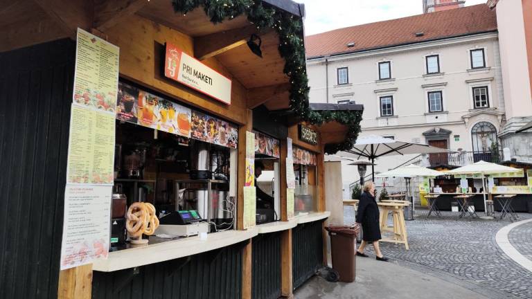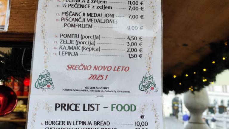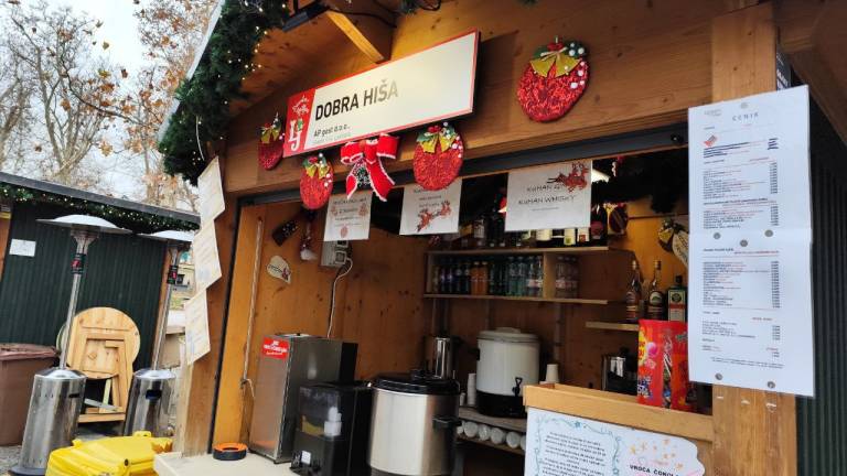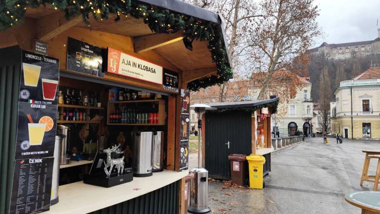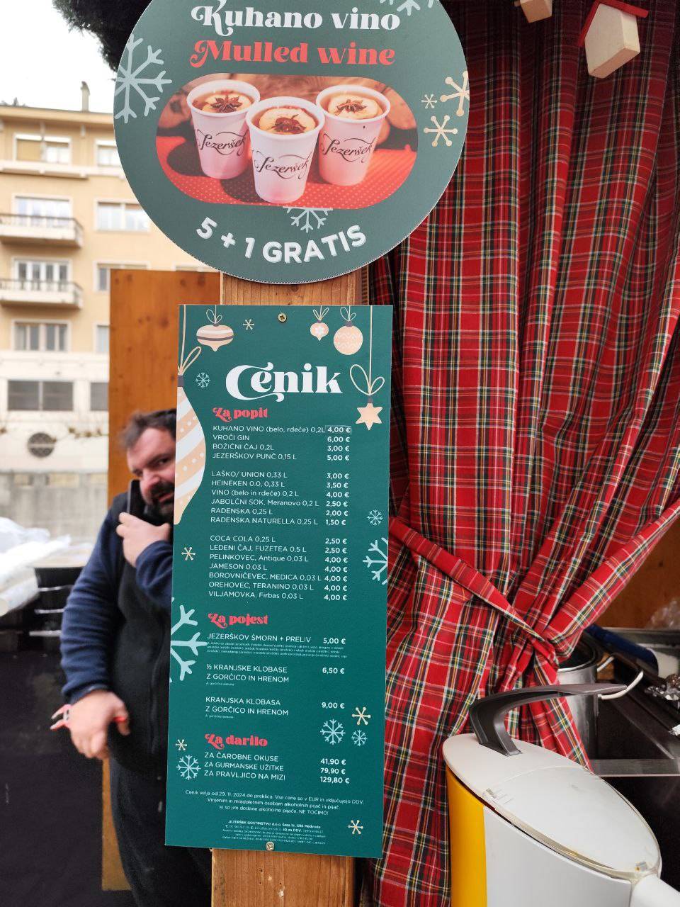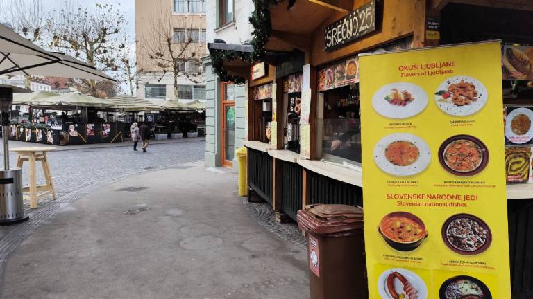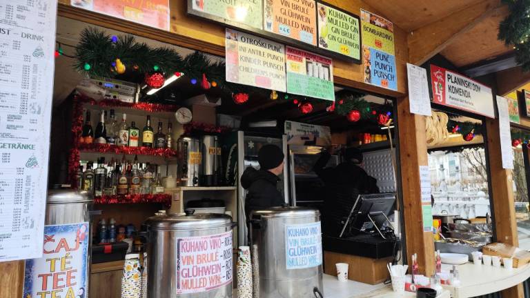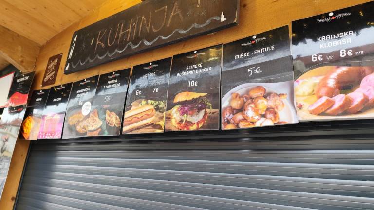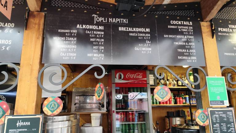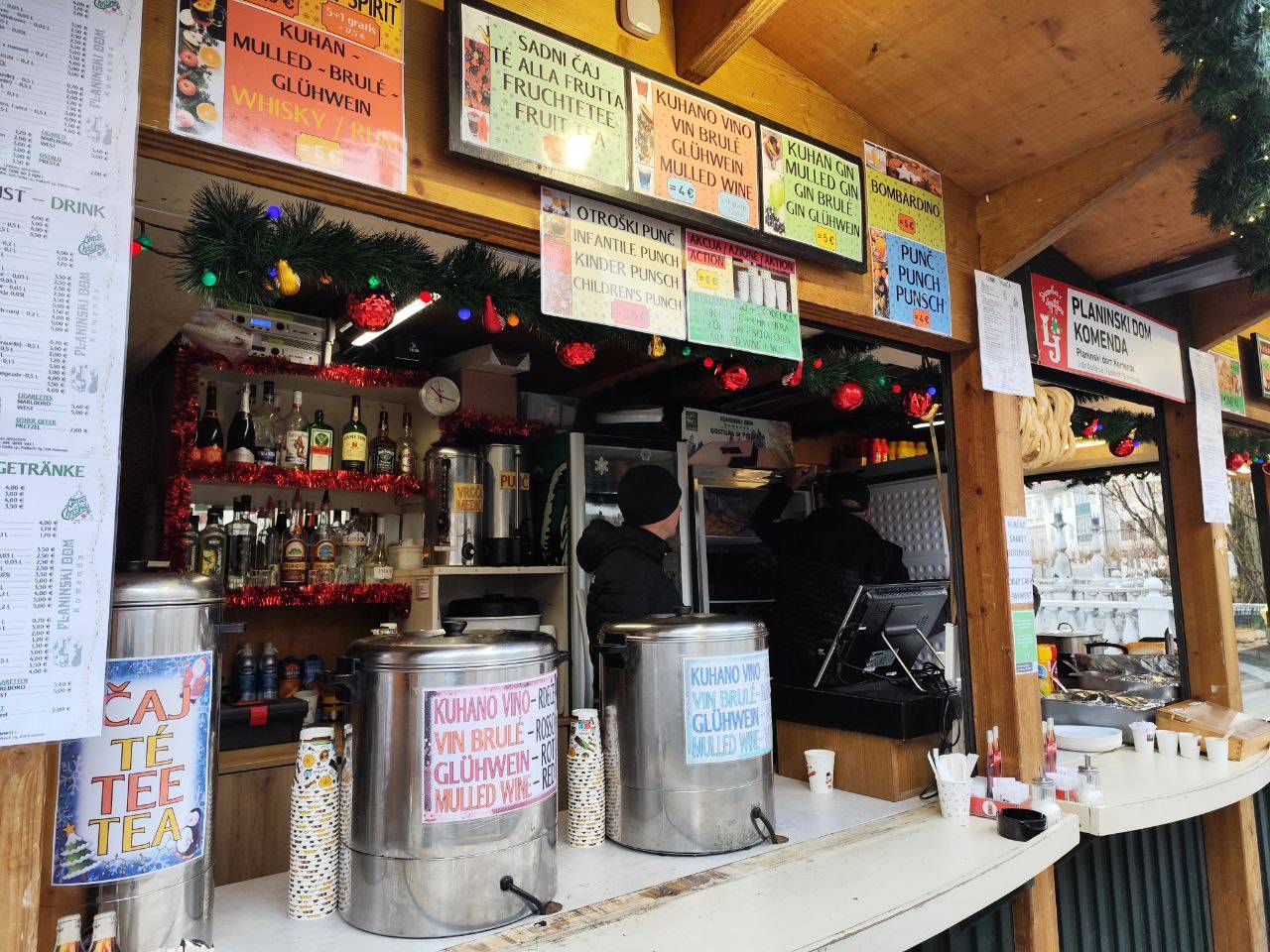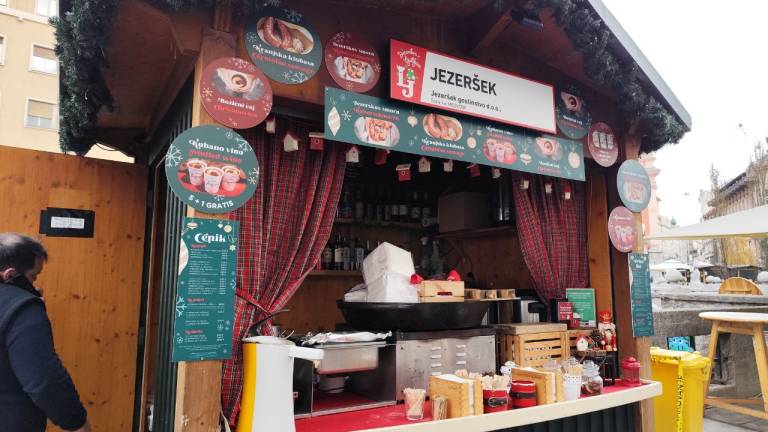 Na primer ljubljansko specialiteto žabje krake za 12 evrov, pa štruklje za pet evrov in pol, ričet za deset evrov, joto, kranjske klobase in ajdove žgance. Kuhano vino tukaj dobite za 3,80 evra, torej ceneje kot pri konkurenci.