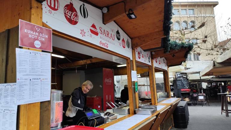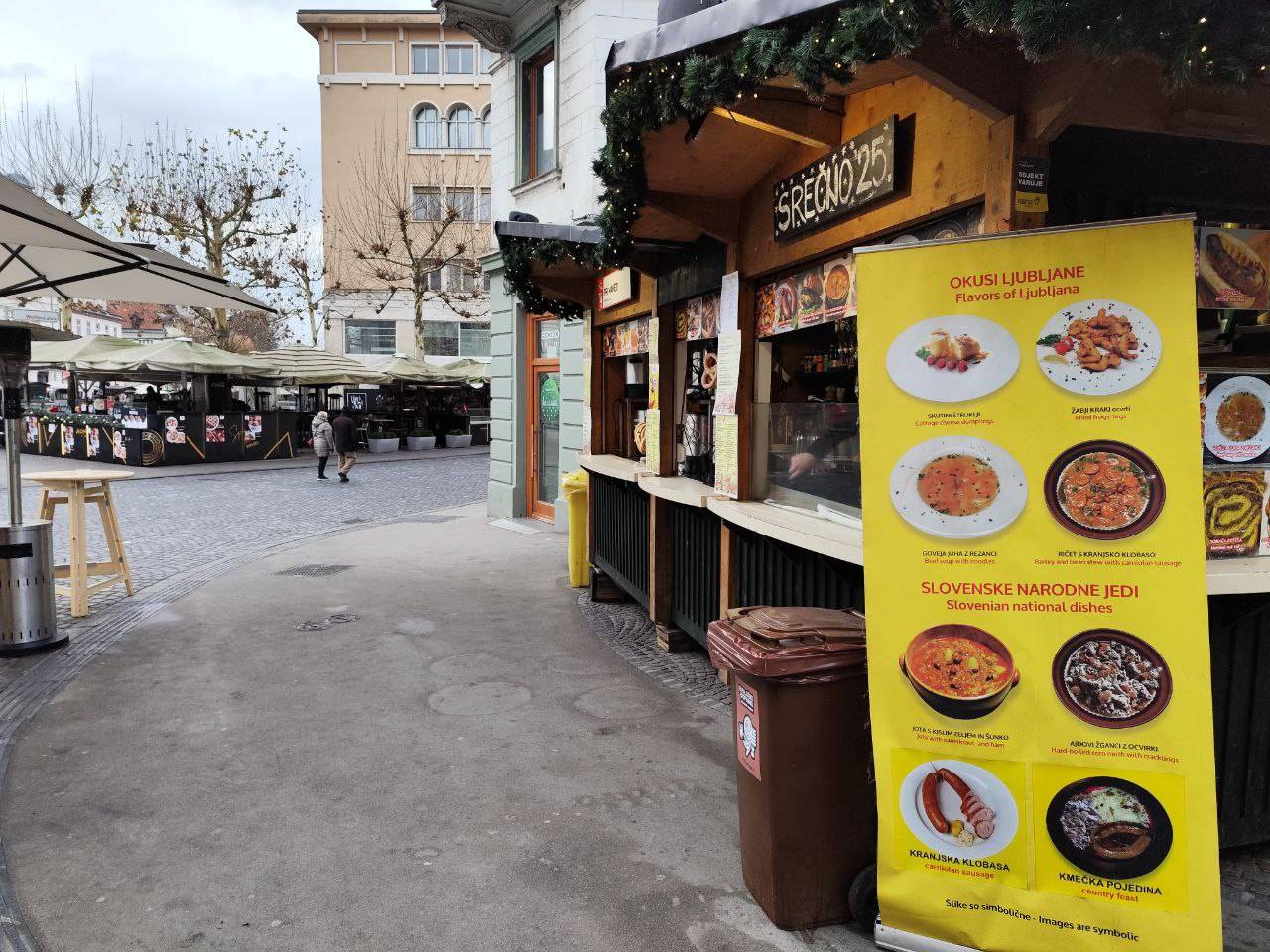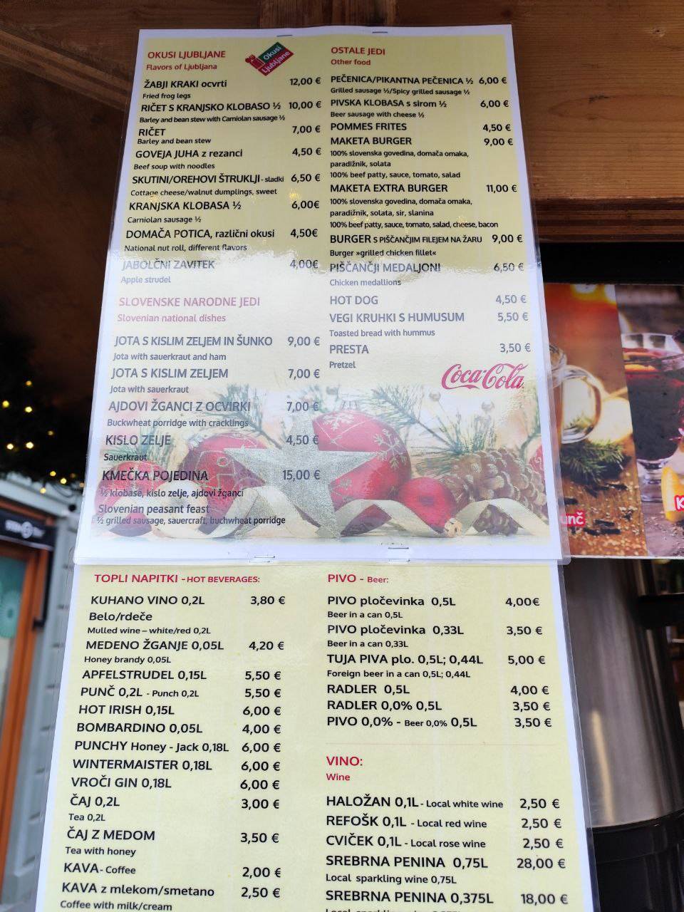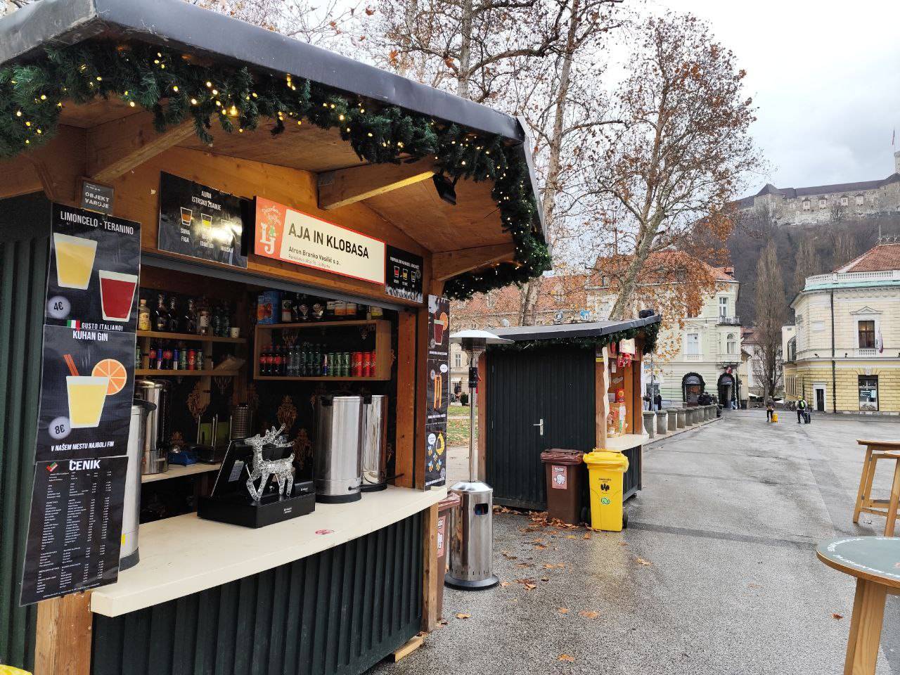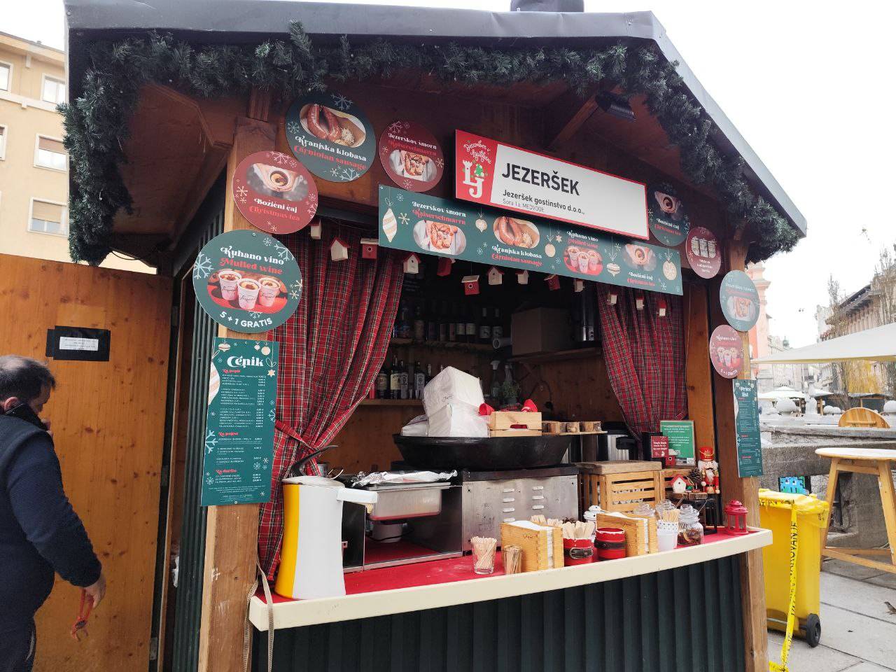 Na primer ljubljansko specialiteto žabje krake za 12 evrov, pa štruklje za pet evrov in pol, ričet za deset evrov, joto, kranjske klobase in ajdove žgance. Kuhano vino tukaj dobite za 3,80 evra, torej ceneje kot pri konkurenci.