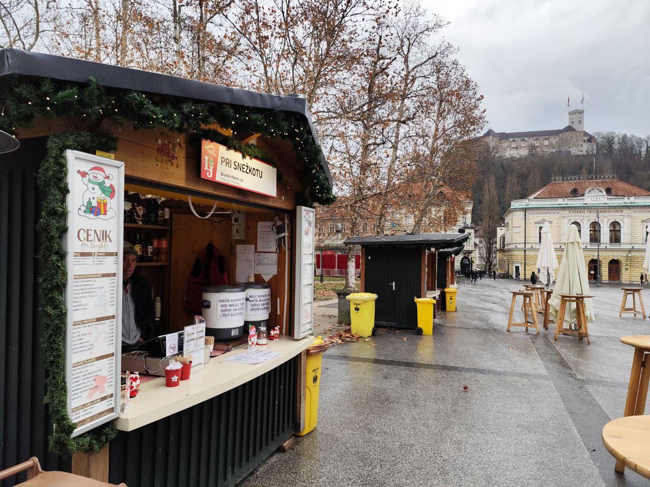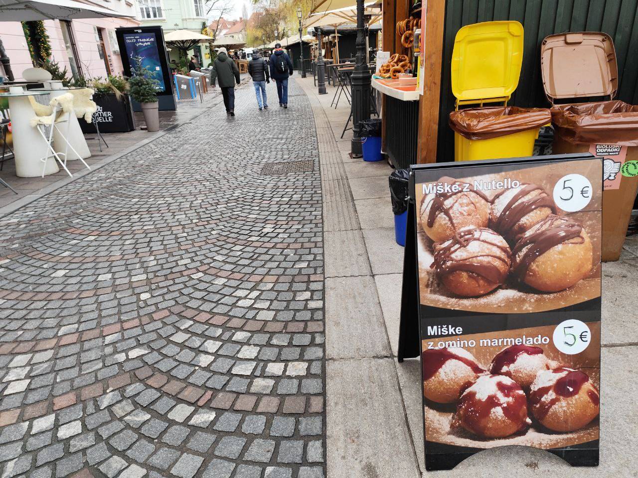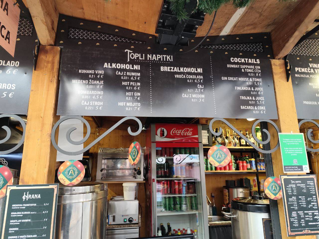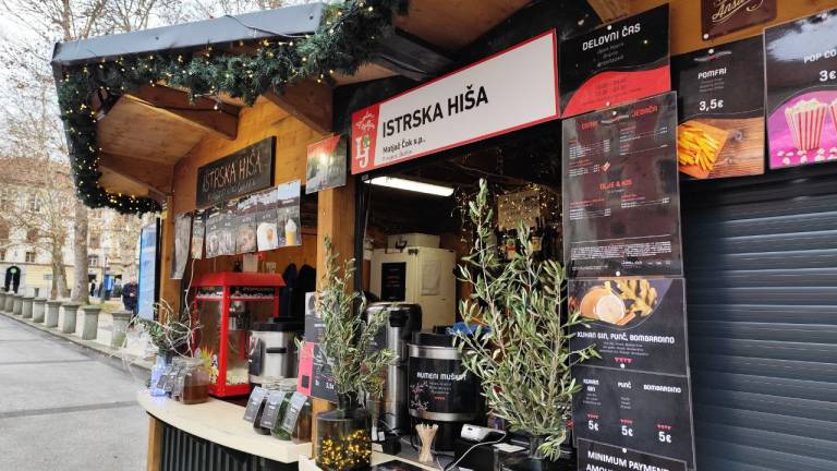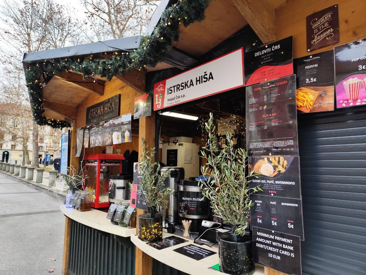 Na primer ljubljansko specialiteto žabje krake za 12 evrov, pa štruklje za pet evrov in pol, ričet za deset evrov, joto, kranjske klobase in ajdove žgance. Kuhano vino tukaj dobite za 3,80 evra, torej ceneje kot pri konkurenci.