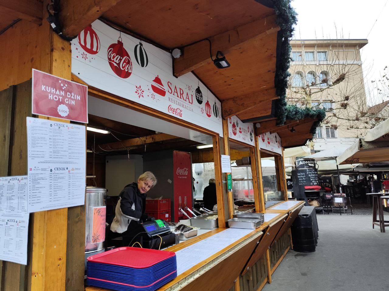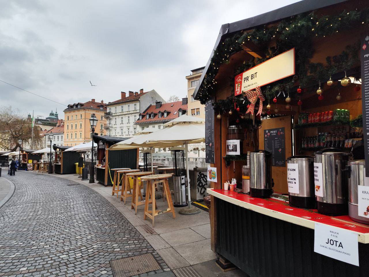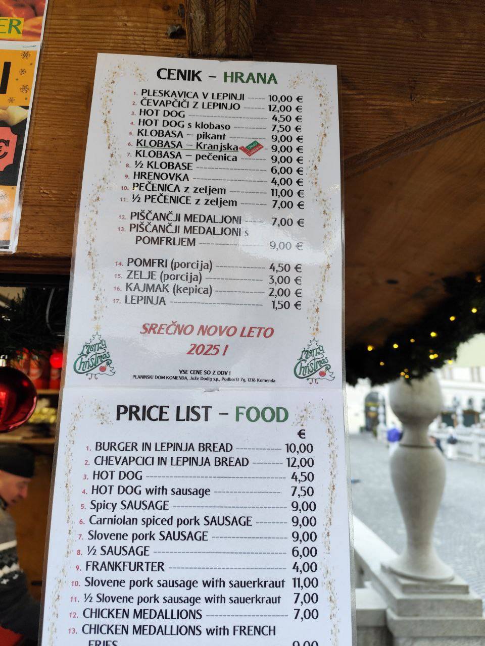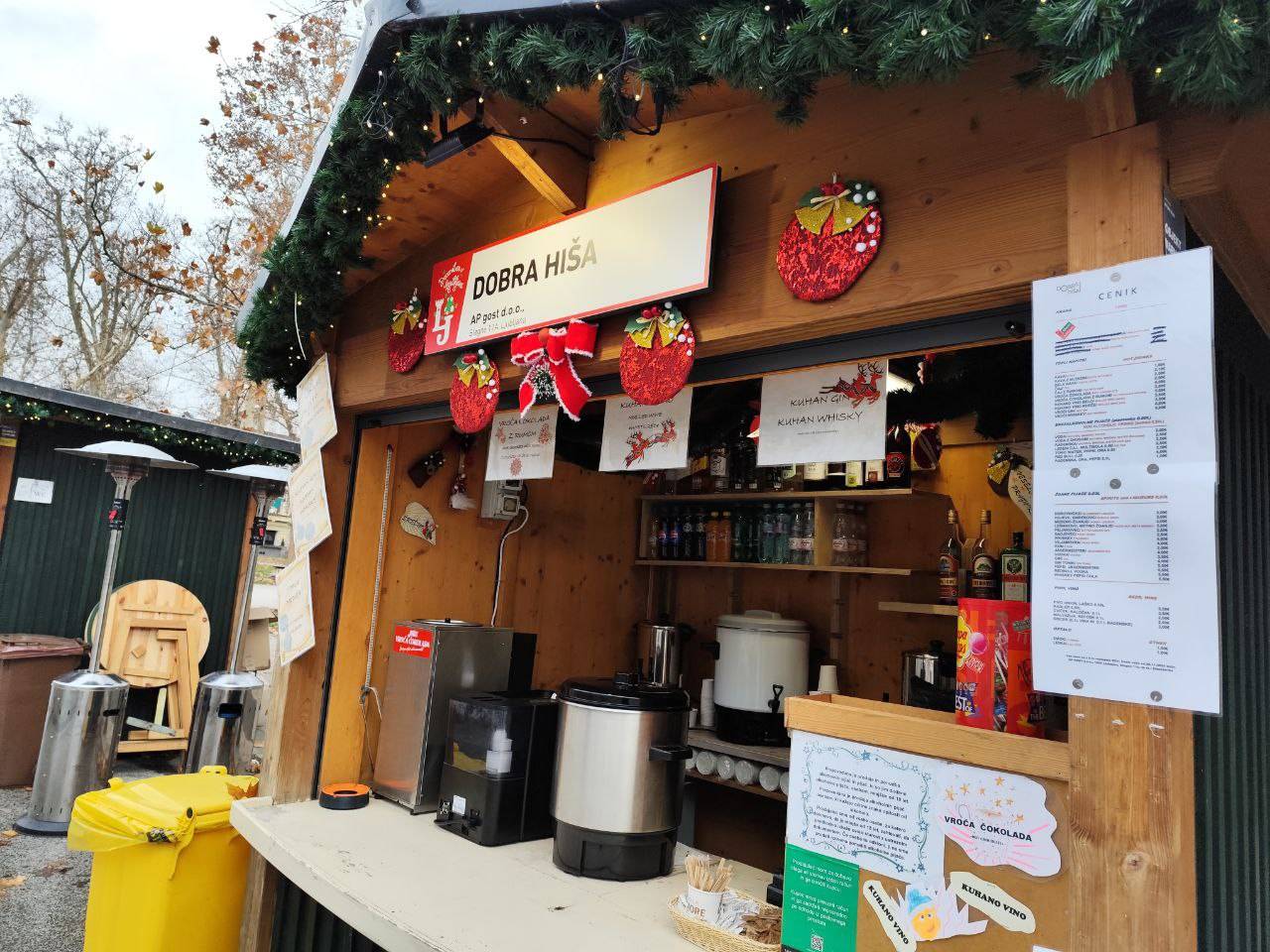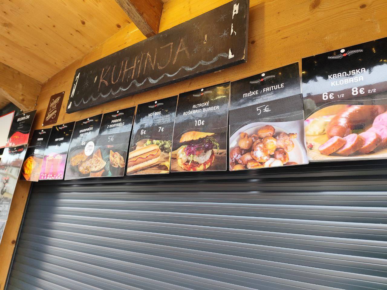 Na primer ljubljansko specialiteto žabje krake za 12 evrov, pa štruklje za pet evrov in pol, ričet za deset evrov, joto, kranjske klobase in ajdove žgance. Kuhano vino tukaj dobite za 3,80 evra, torej ceneje kot pri konkurenci.