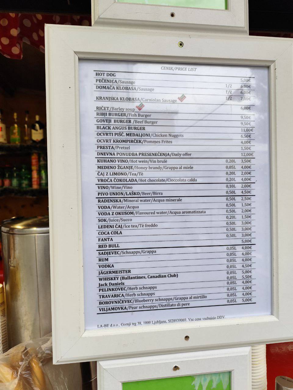 Kuhano vino stane štiri evre, kuhan gin pet evrov, punč štiri evre in bombardino pet evrov. Čaj stane tri evre in otroški punč štiri evre in pol.