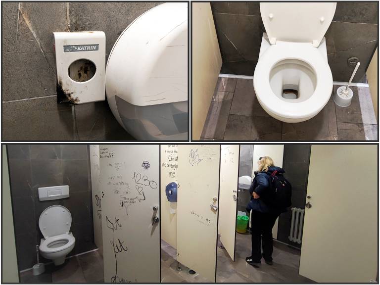 Edina opazna pomanjkljivost so bila nekoliko slabše zapirajoča se vrata posameznih kabin, poleg tega pa je bil na določenih mestih inventar (kot so držala za toaletni papir in držala za vrečke za higienske vložke) poškodovan; na nekaterih mestih so bile vidne ožganine od cigaret in zareze ostrih predmetov.