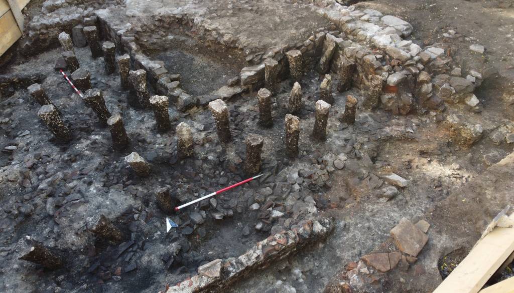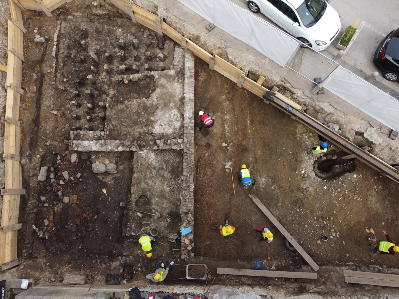 Po odstranitvi novodobnih in novoveških nasutij so na globini 0,7 metra naleteli na zidove stanovanjskega objekta. Gre za insulo XVIII in cesto dekuman J. Odkritja po ocenah sodijo v 3. in 4. stoletje našega štetja.