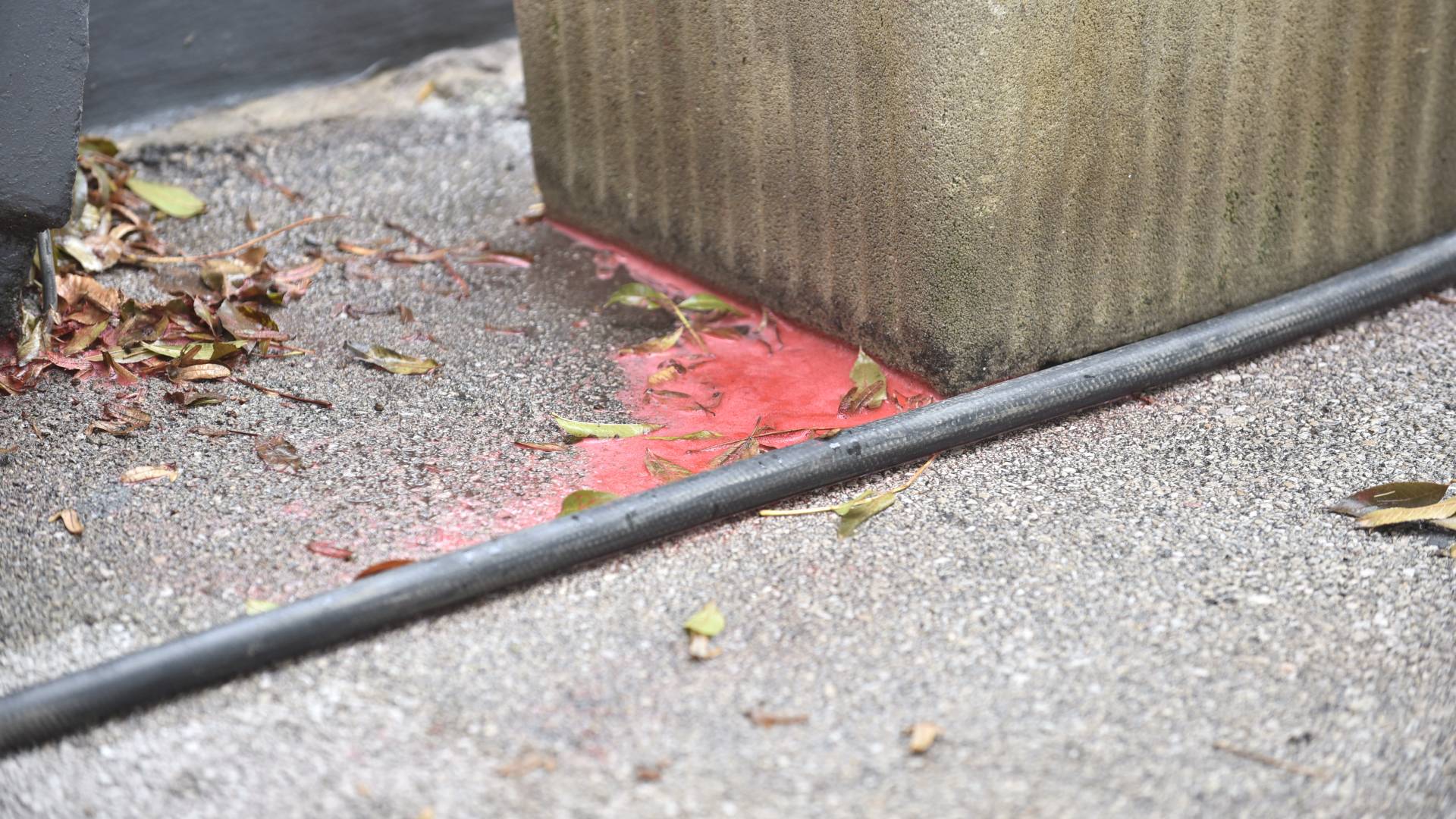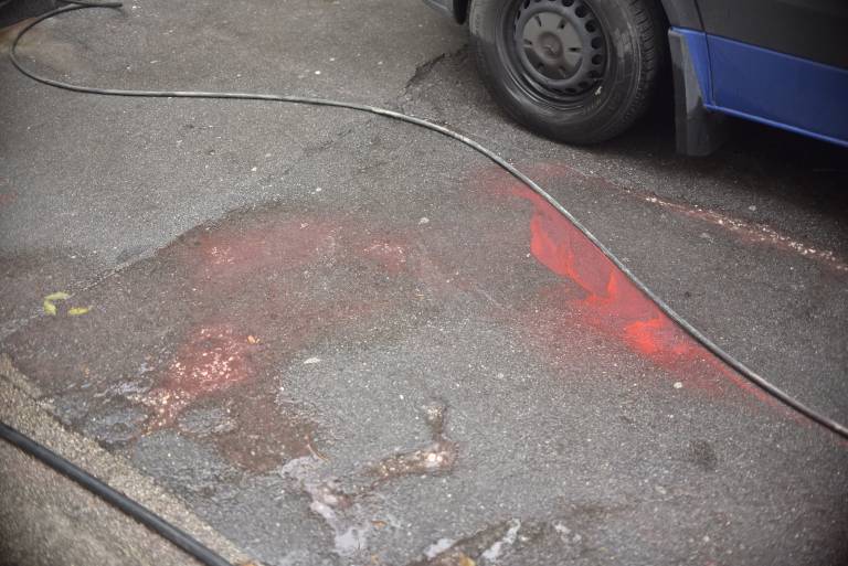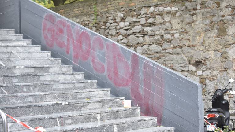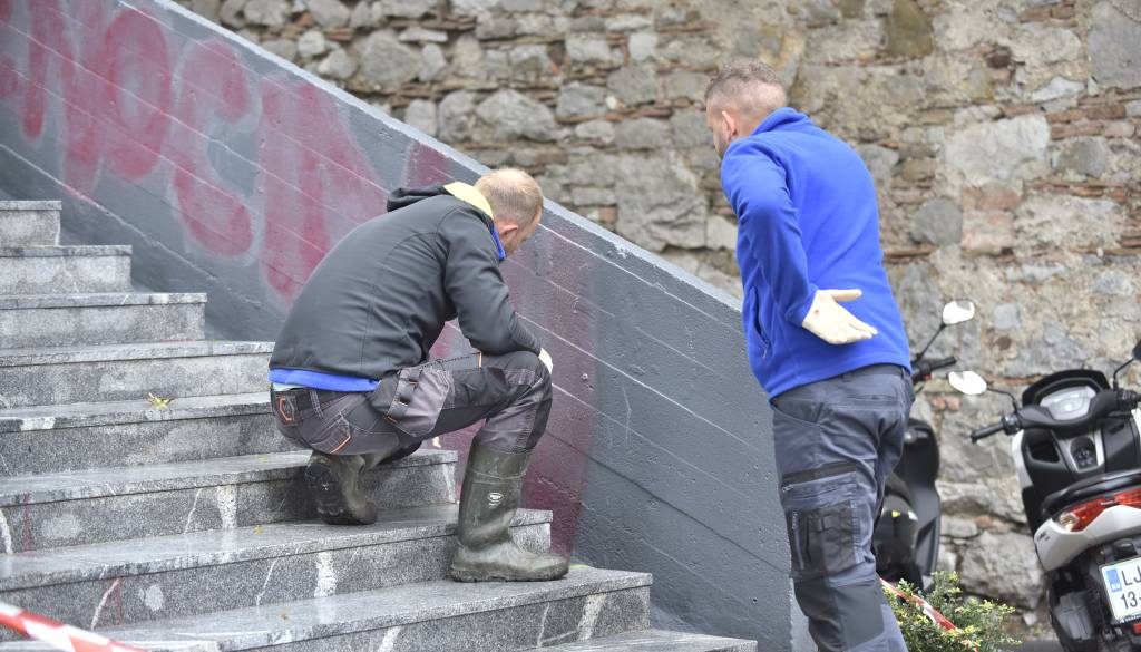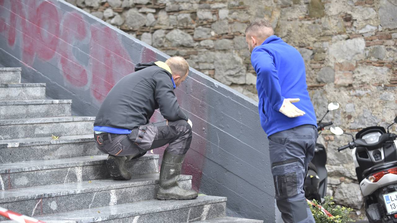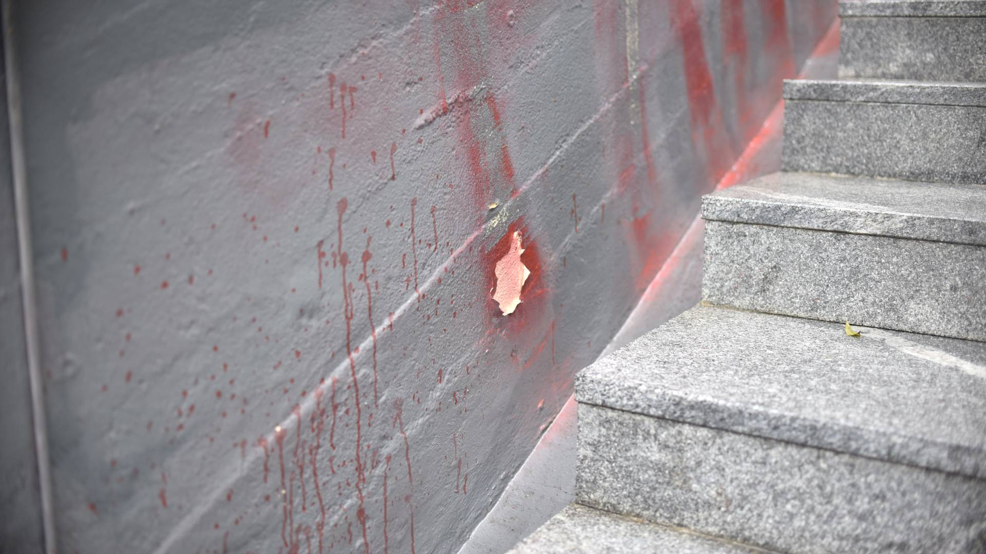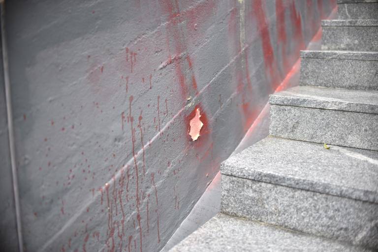 Na Fakulteti za strojništvo čistijo trdovratno rdečo barvo in napis 'partner genocidu' na stopnišču.