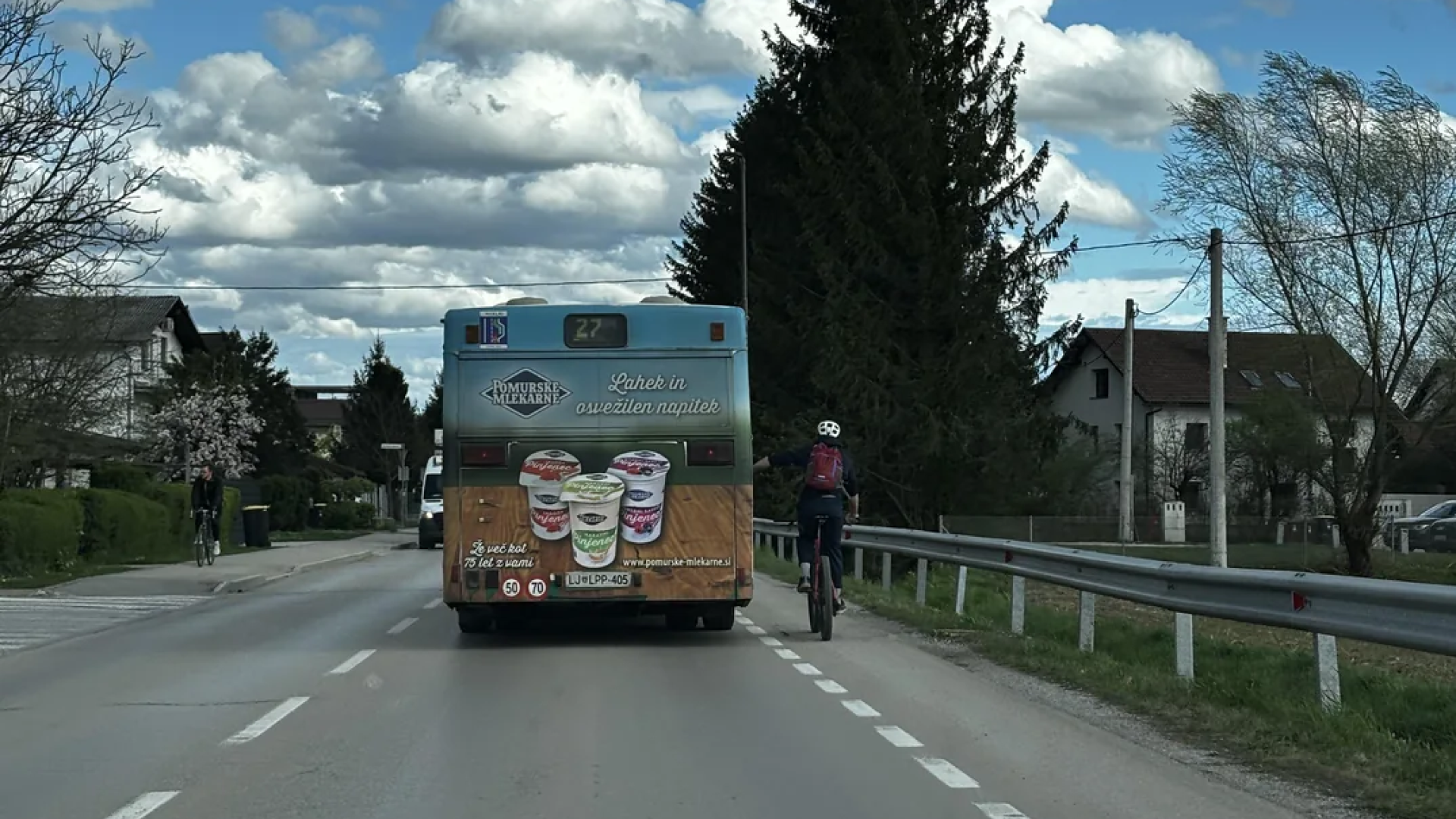 Eden od uporabnikov Reddita je včeraj objavil fotografija kolesarja, držečega se za zadnji del avtobusa Ljubljanskega potniškega prometa na liniji 27, ki vozi od Letališke do Rudnika.