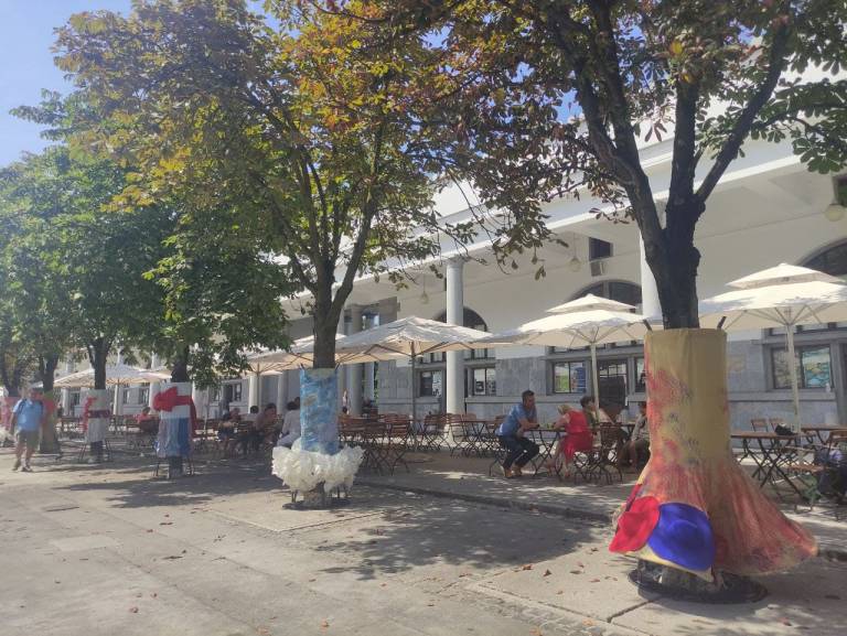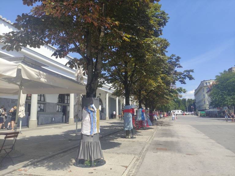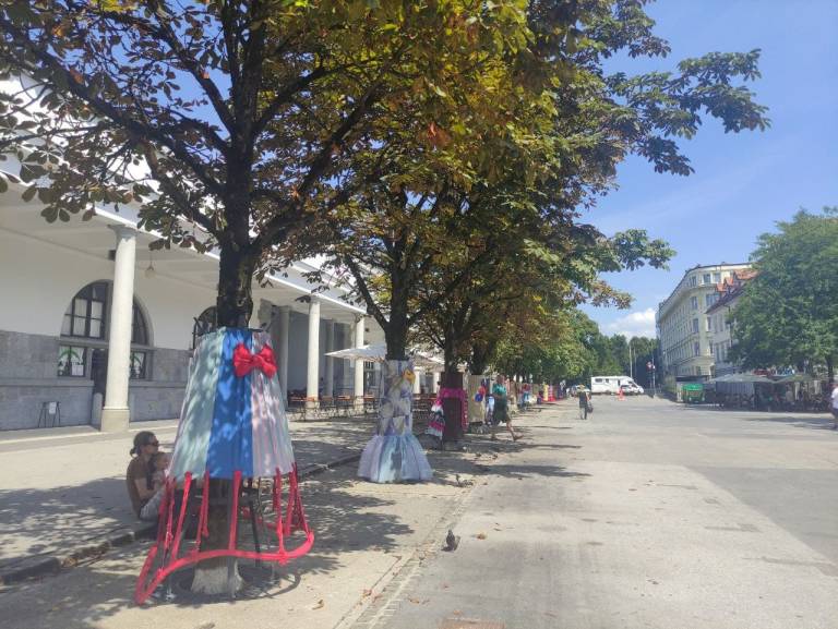 Kostumi niso neposredno na drevesih, temveč na kovinskih ogrodjih, ki drevesa pri tržnici obdajajo že nekaj let.