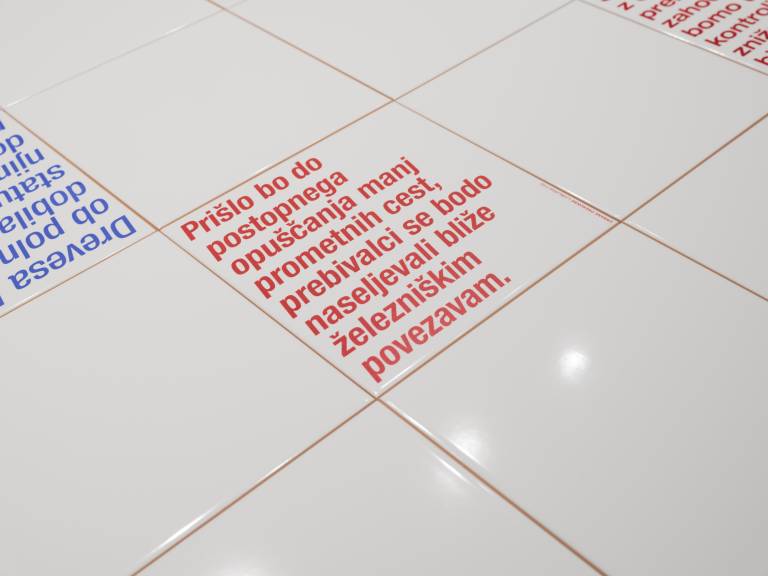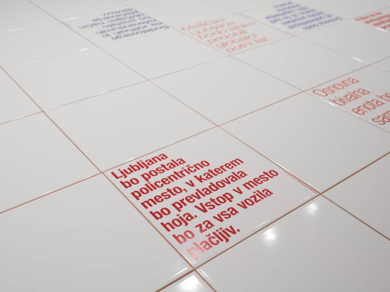 Urbane prerokbe na razstavi so zapečene na keramične ploščice.