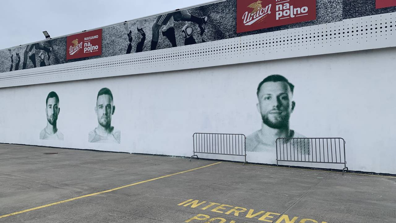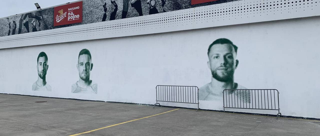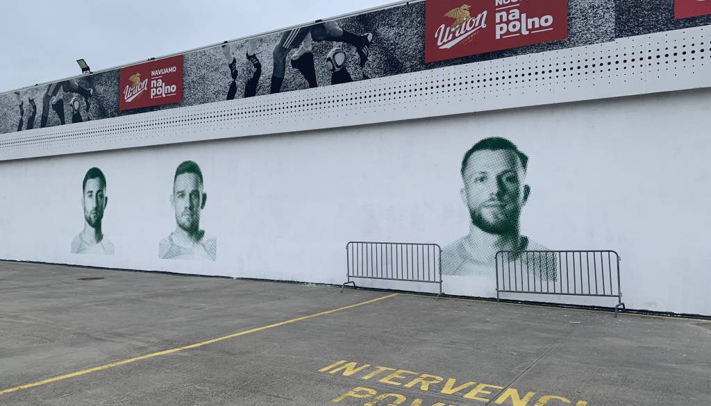 Tam so namreč na fasado Stožic po naročilu Nogometne zveze pri ljubljanski občini uredili posebno poslikavo. Ustvaril jo je umetnik Matej Andraž Vogrinčič. Poslikava prikazuje - bolje rečeno je prikazovala - štiri slovenske reprezentante; nekdaj za kratek čas heroja ljubljanske Olimpije Andraža Šporarja, trenutnega kapetana zeleno-belih Timija Maxa Elšnika, nekdanjega branilca šišenskega Brava Davida Brekala ter Petra Stojanovića.
