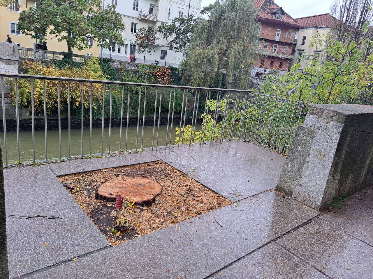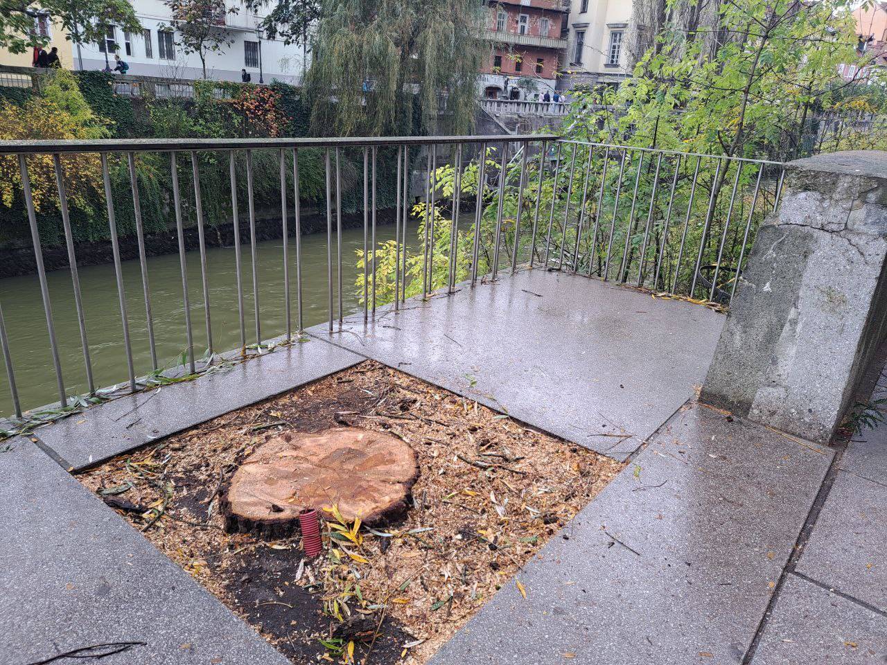 Danes se je s Cankarjevega nabrežja poslovila pobešava bukev. Kot so sporočili z Mestne občine Ljubljana, je drevo zaradi številnih razkrojev predstavljalo nevarnost za mimoidoče.