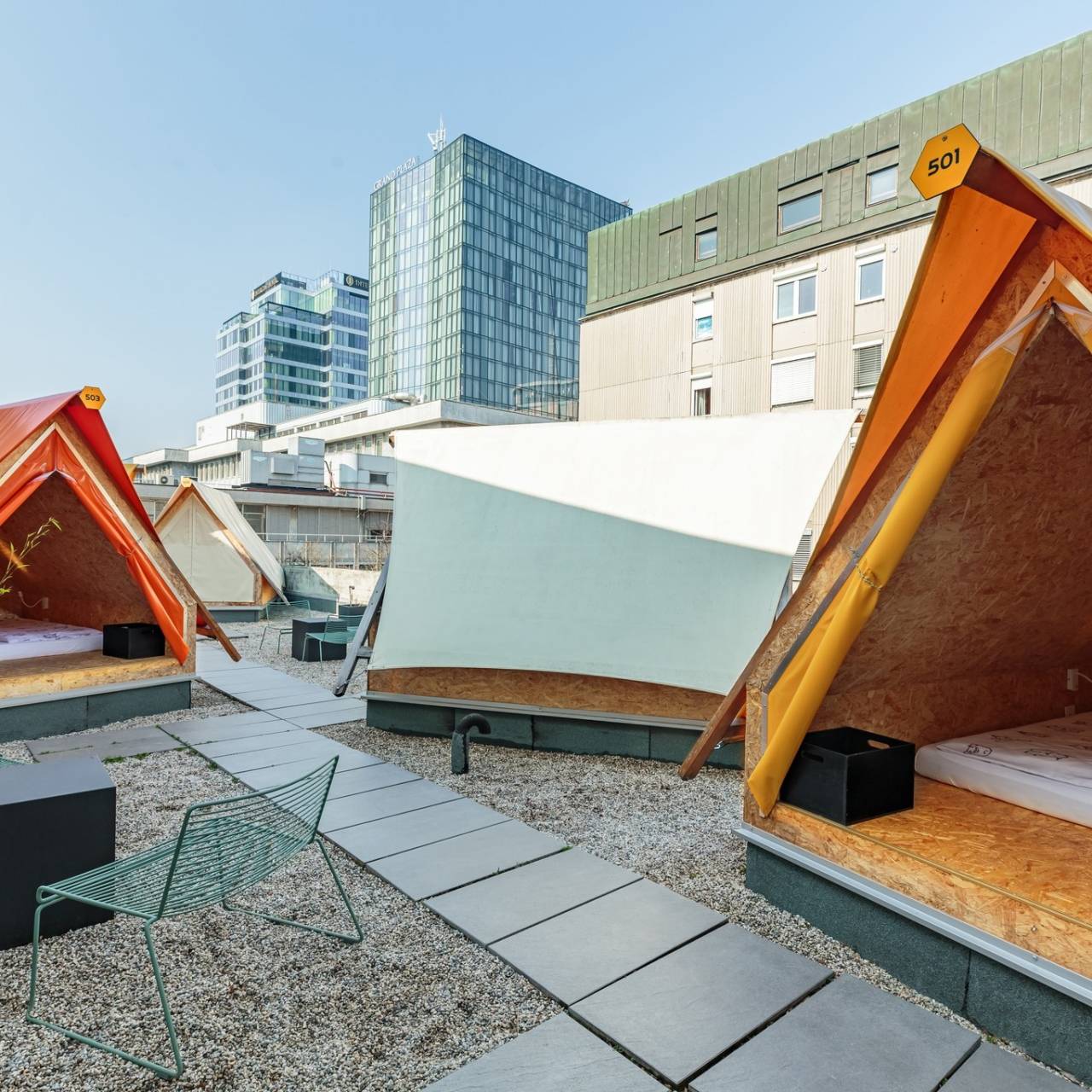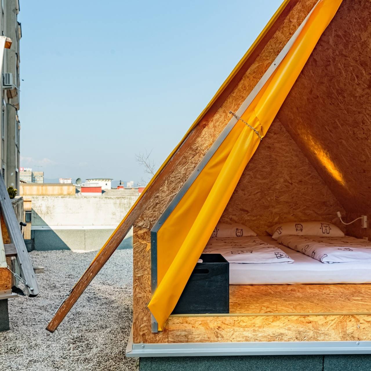 Skratka, gre za šotore na strehi ljubljanskega hotela The Fuzzy Log. Glamping, temu pravijo.