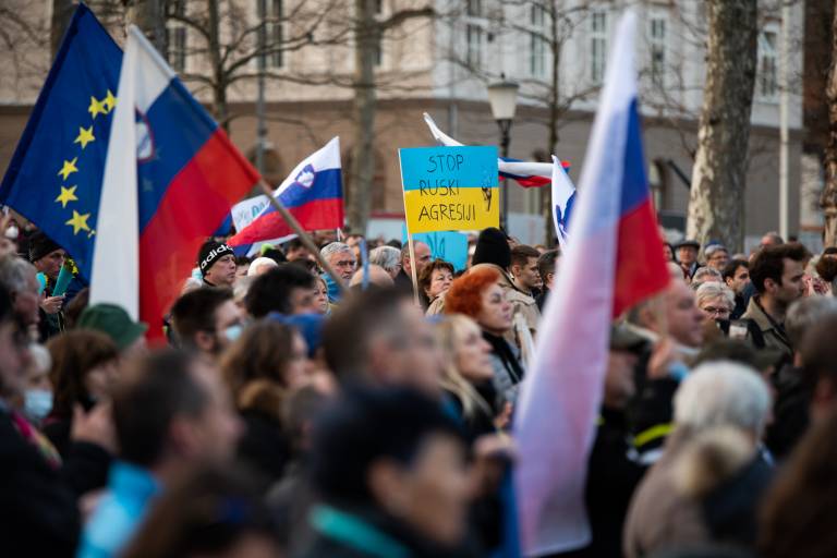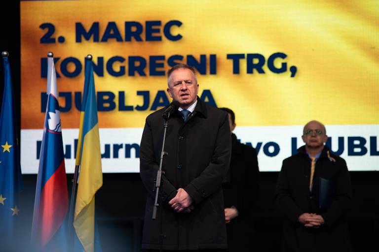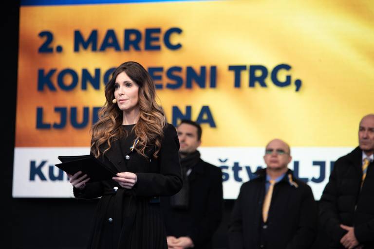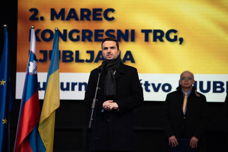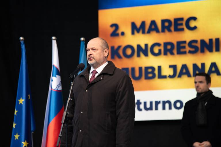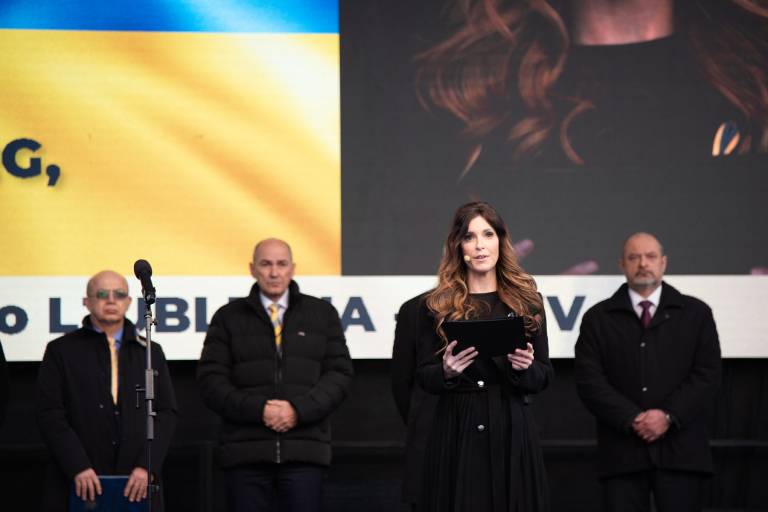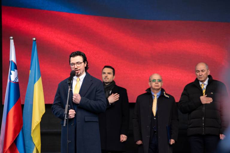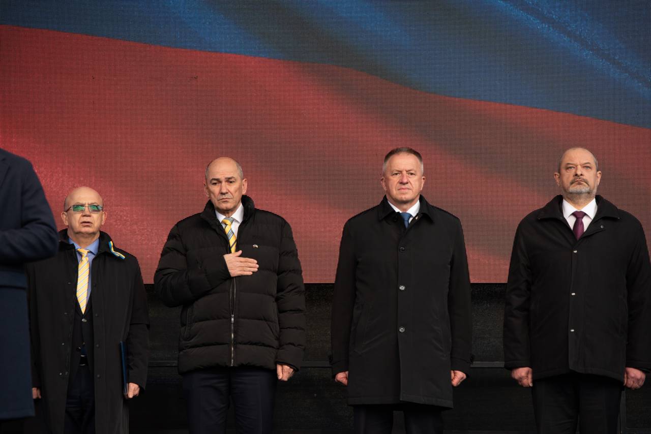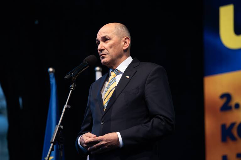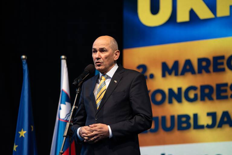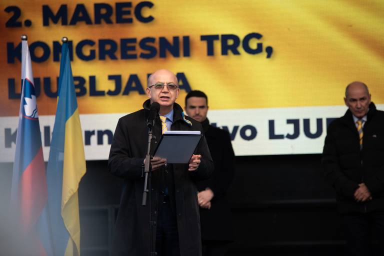 Shoda se je udeležil tudi Janez Janša, ki je nagovoril zbrano množico. »V Ukrajini se danes ne borijo samo za svobodo, demokracijo in evropsko prihodnost. Borijo se za življenje. Če je ogroženo življenje, je ogroženo vse,« je povedal.