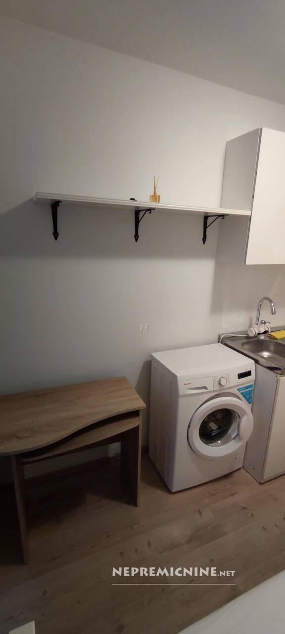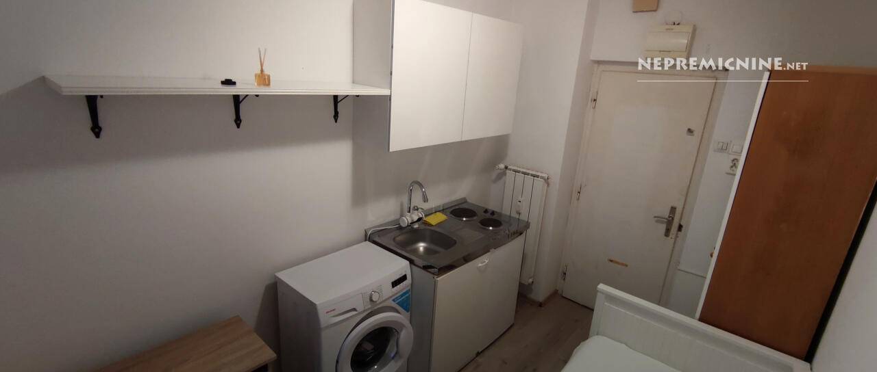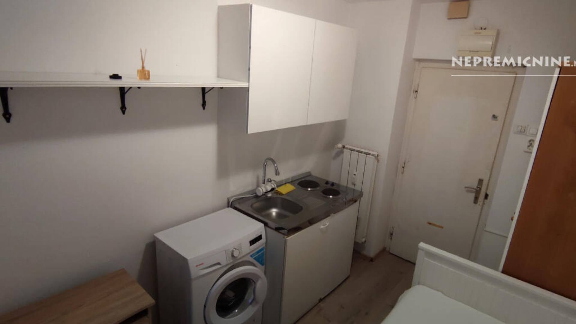 V sobi so postelja, pralni stroj in kuhinjska niša.