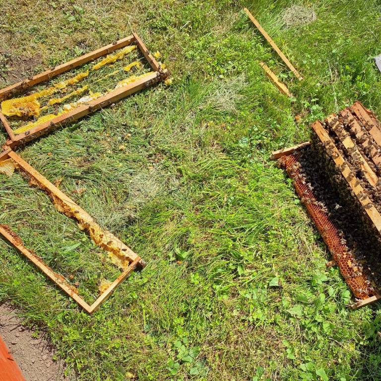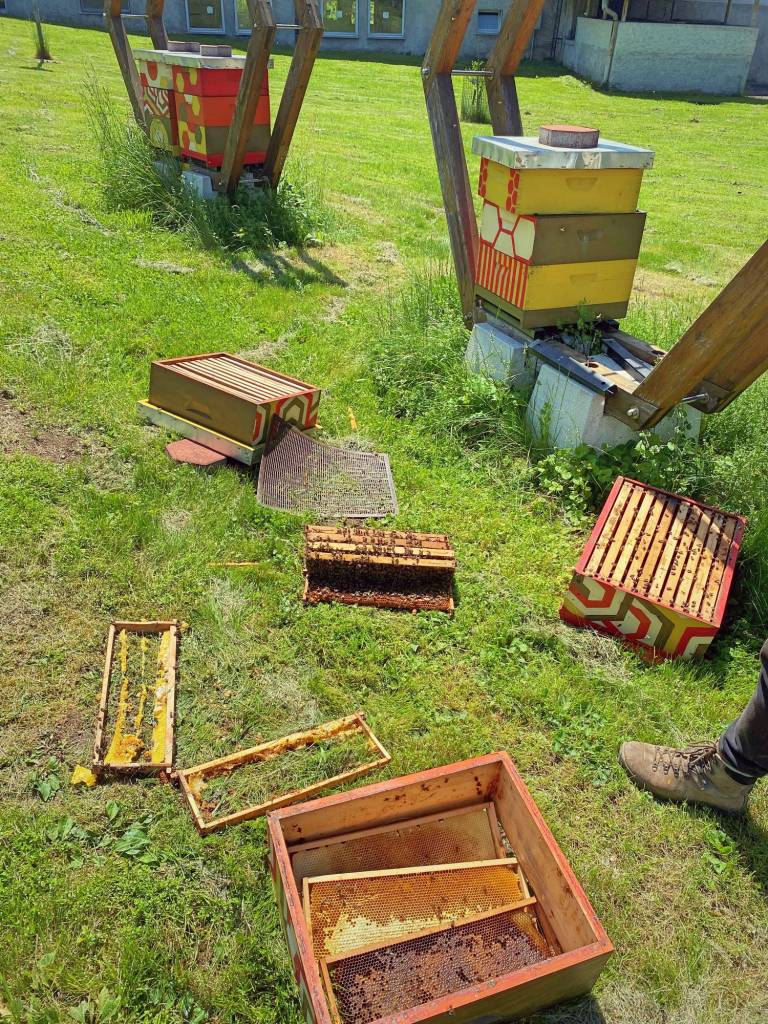 Kot so sporočili, je tja včeraj ponoči vdrl medved in podrl enega od panjev. Medišče je ostalo nedotaknjeno, je pa postrgal vso beljakovinsko zalego in uničil eno od štirih družin.