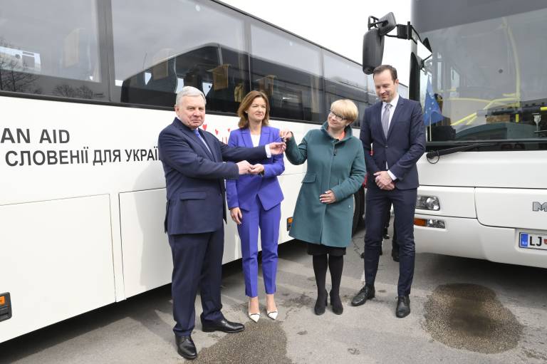Namestnik direktorja Ljubljanskega potniškega prometa Rok Vihar in ministrica za zunanje zadeve Tanja Fajon sta veleposlaniku Ukrajine v Sloveniji Andriju Taranu predala dva avtobusa, ki ju v okviru solidarnostne kampanje Evropske unije doniramo Ukrajini.