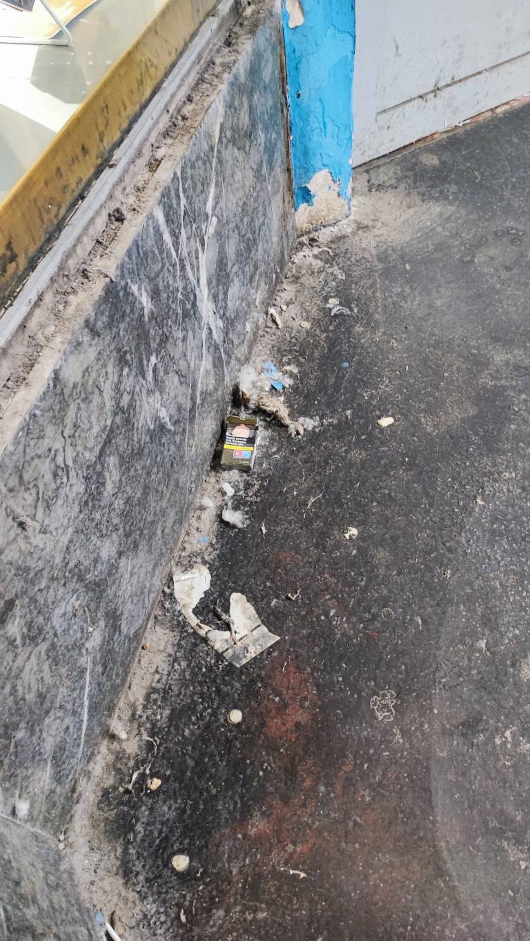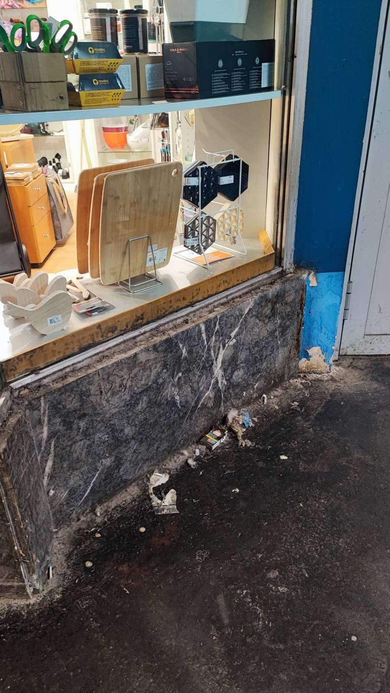 Pod izložbami podhoda se nabira umazanija; staro odpadlo listje, škatlice od cigaret, embalaža od pijač. Če pogledamo navzgor, opazimo manjkajoče stropne plošče.