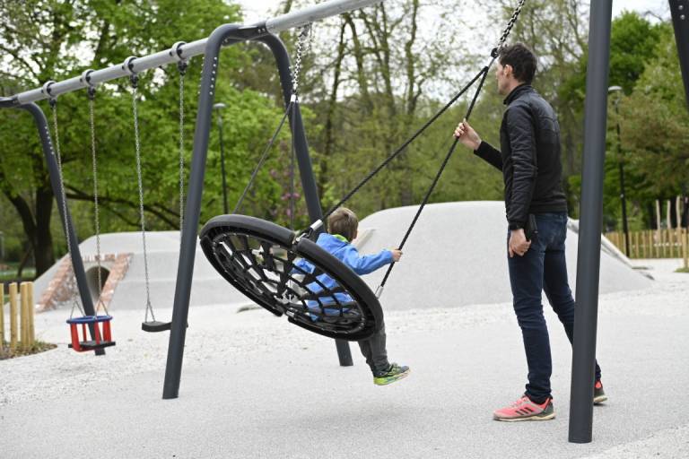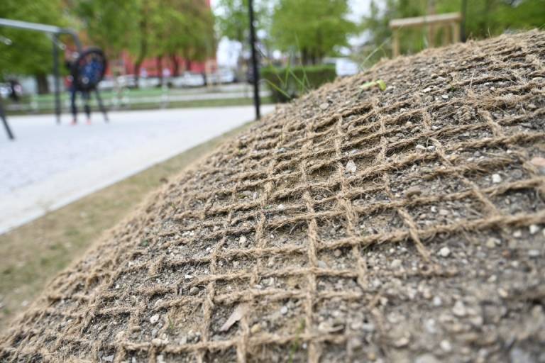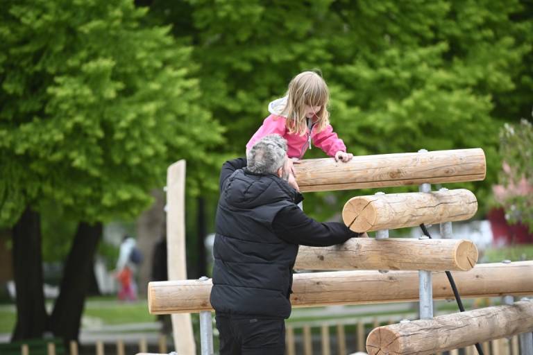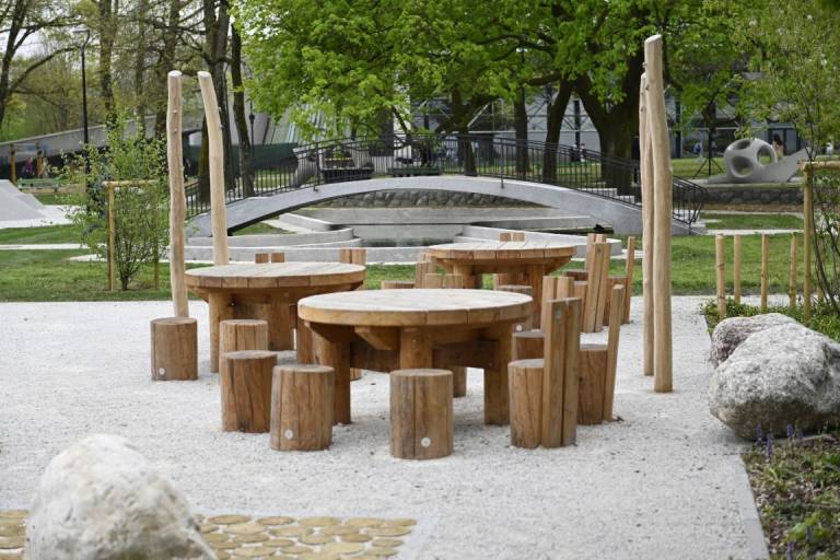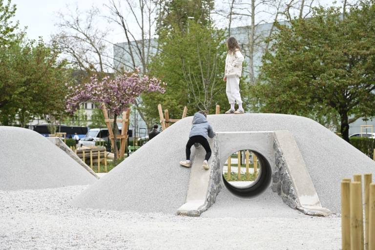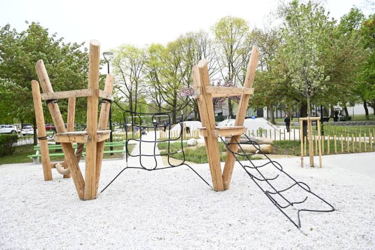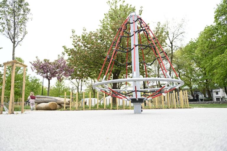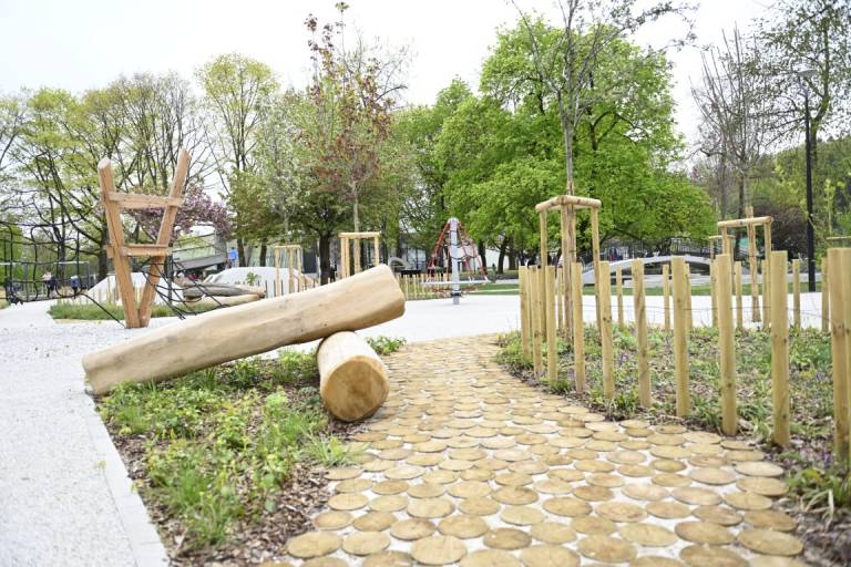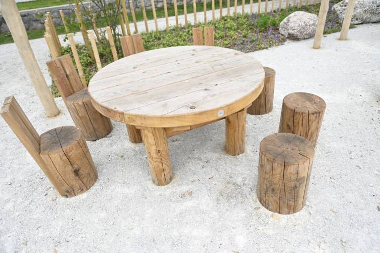 Otroci se lahko igrajo na lesenih plezalnih konstrukcijah, vrtiljakih in gugalnicah z vrvmi, prostor pa dopolnjujejo griči, travnate površine in naravni materiali, ki omogočajo prosto igro.