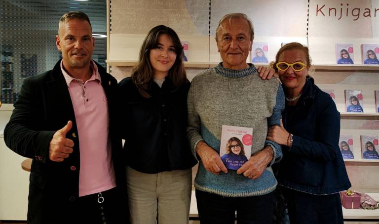 Poleg hčerke Karmen, ki je bila ena ključnih govornic večera, so se dogodka udeležili še sin Simon, mož Mirč in vnukinja Ana. S svojimi zgodbami o Aniti in življenju z njo so se z veseljem pridružili trojici za omizjem.