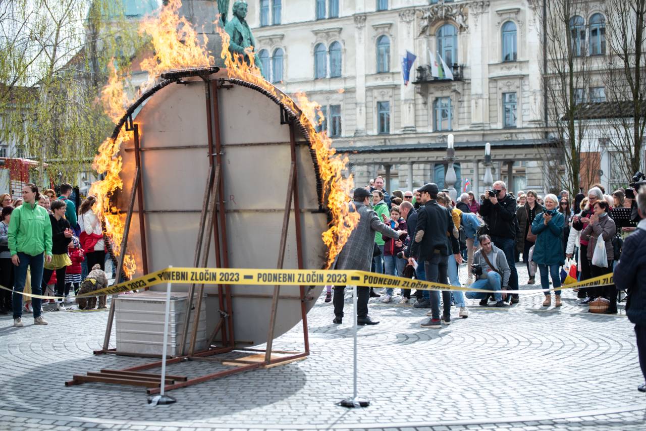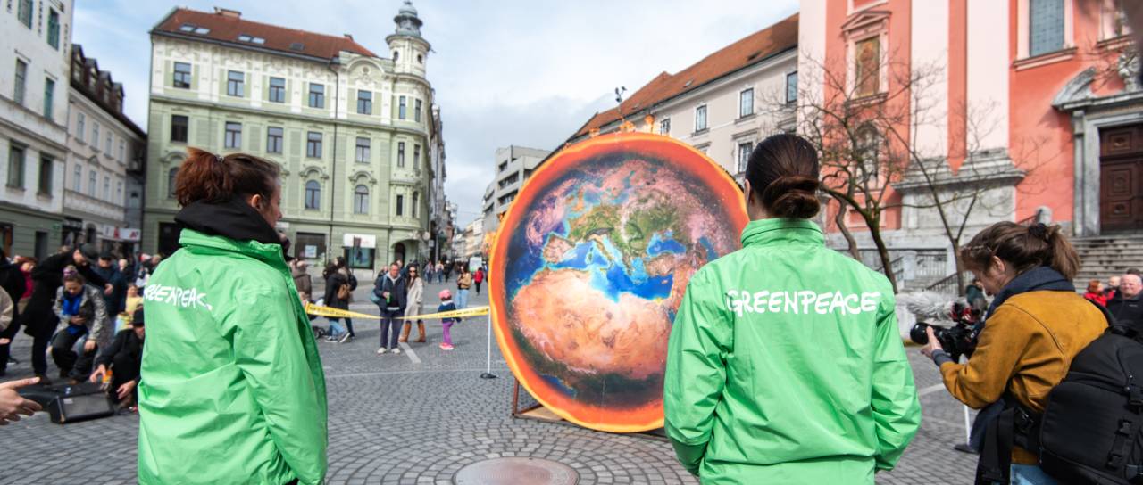 Greenpeaceovi aktivisti so danes, v soboto, 1. aprila, ob 10.30 v centru Ljubljane na Prešernovem trgu izvedli intervencijo 'Zemlja gori'’.