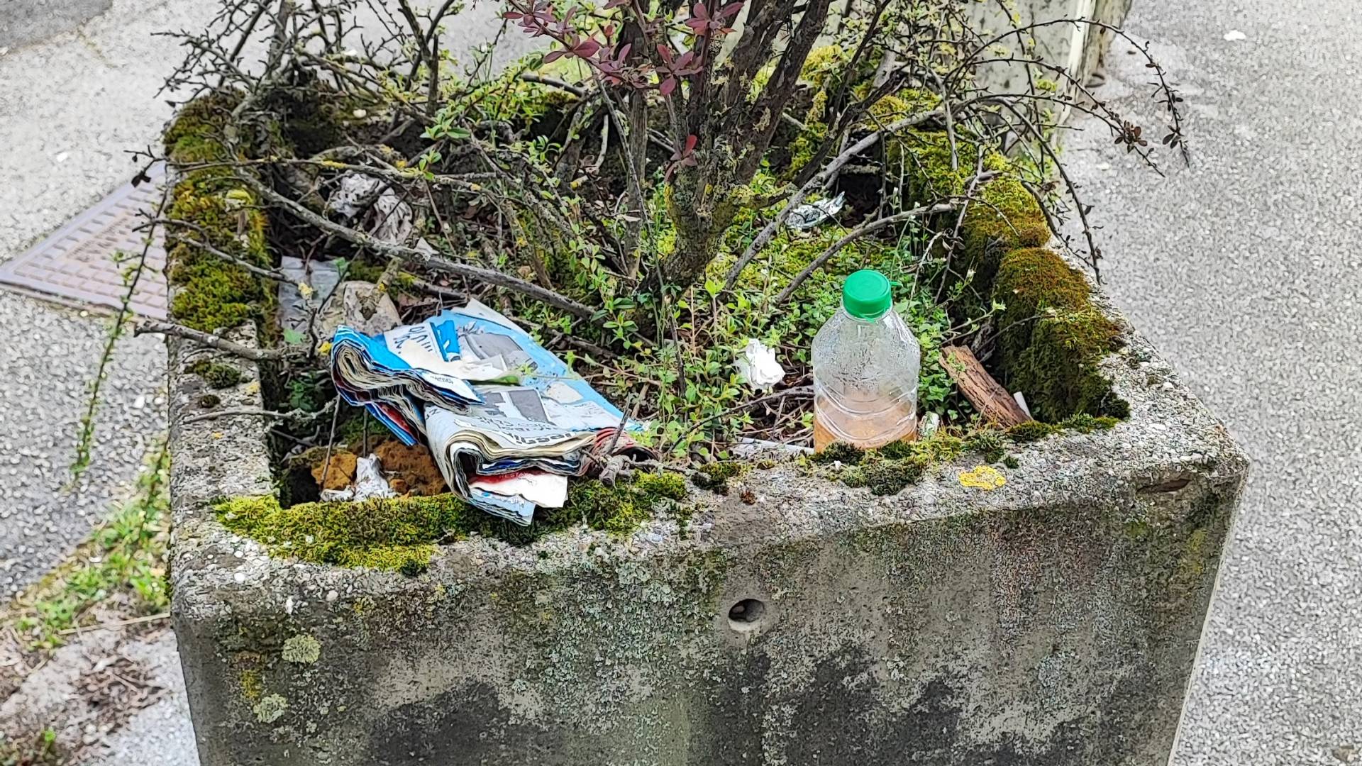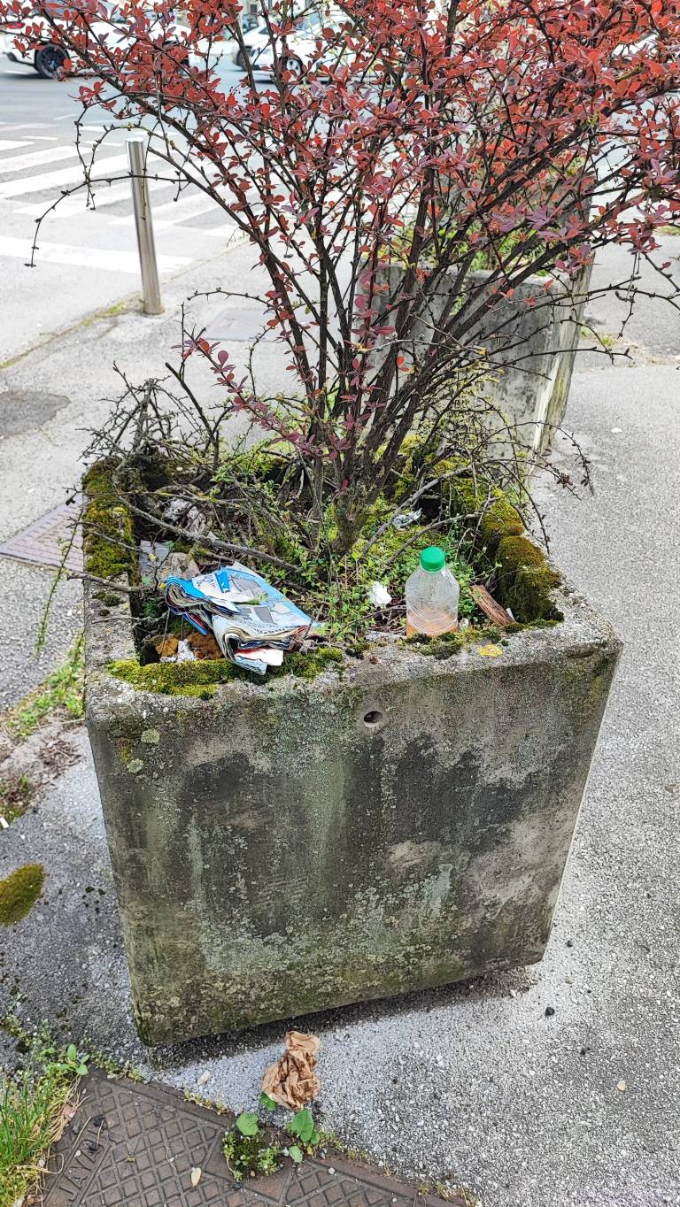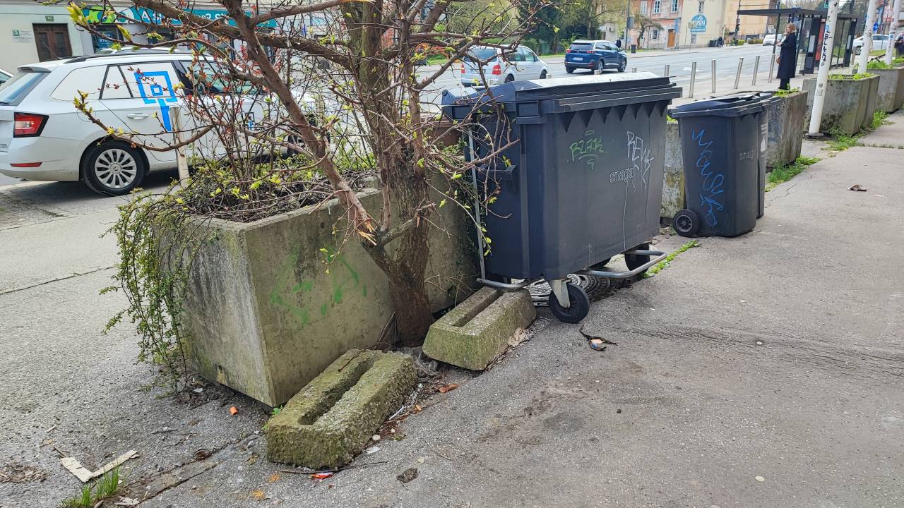 Pred obrtno zbornico in pošto so nekatera betonska korita poškodovana. V njih je zasaditev, ki nujno potrebuje osvežitev, med rastlinjem pa je bolj opazna kopica smeti kot karkoli drugega.
