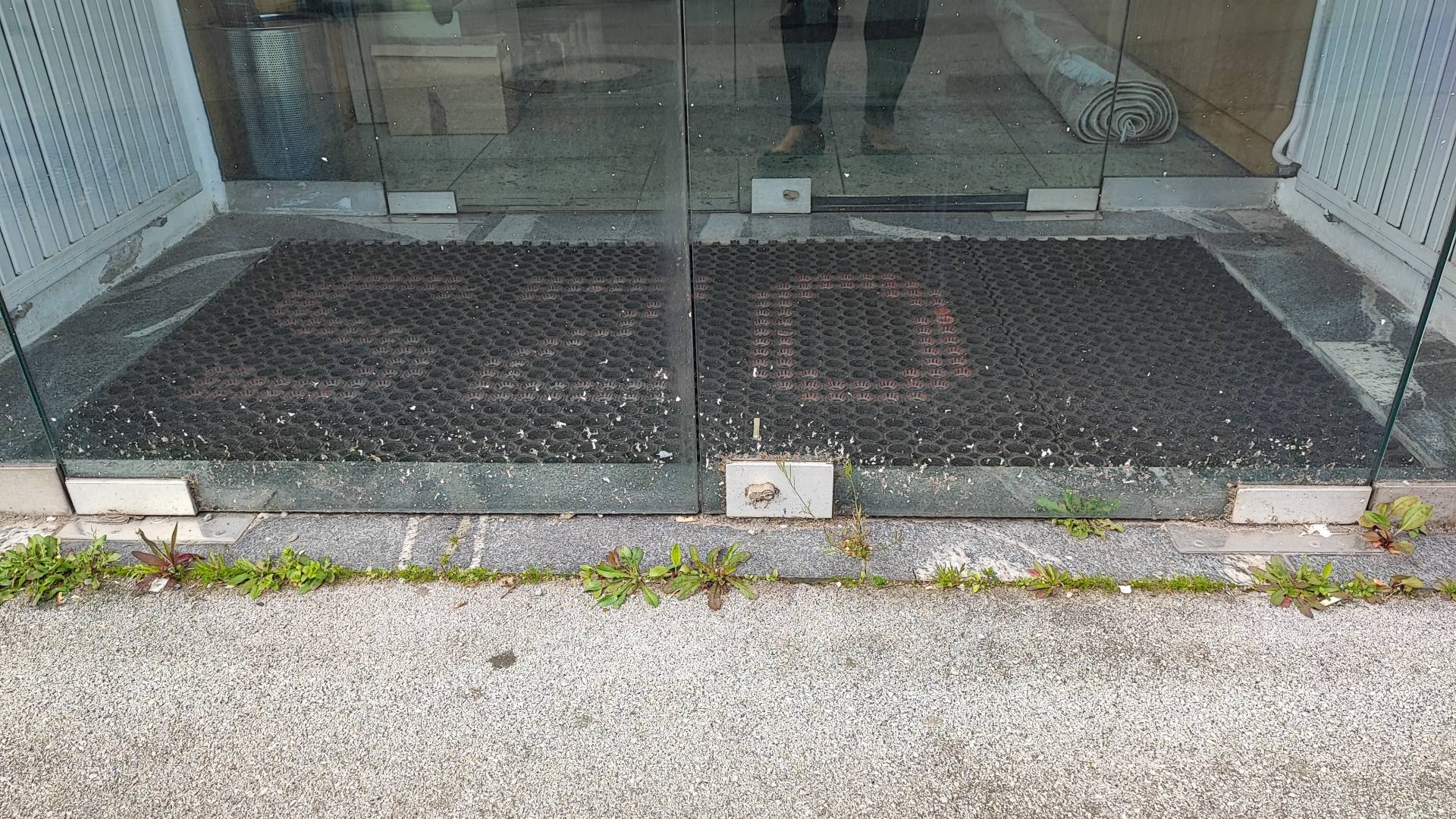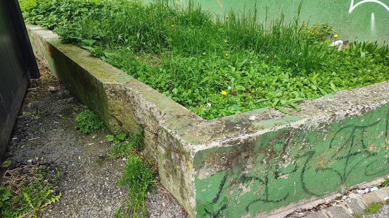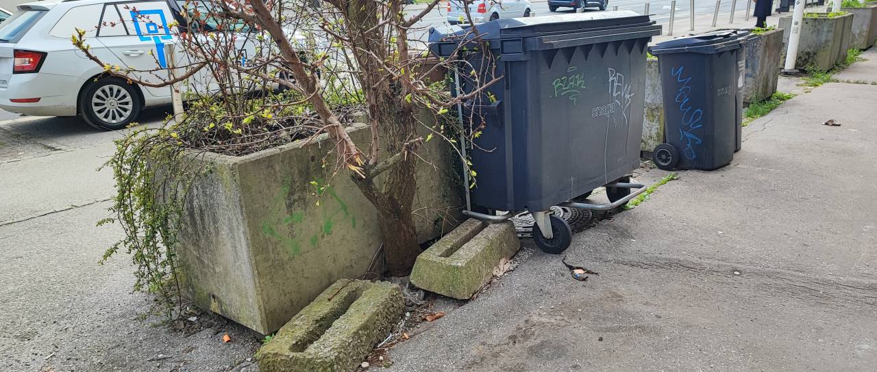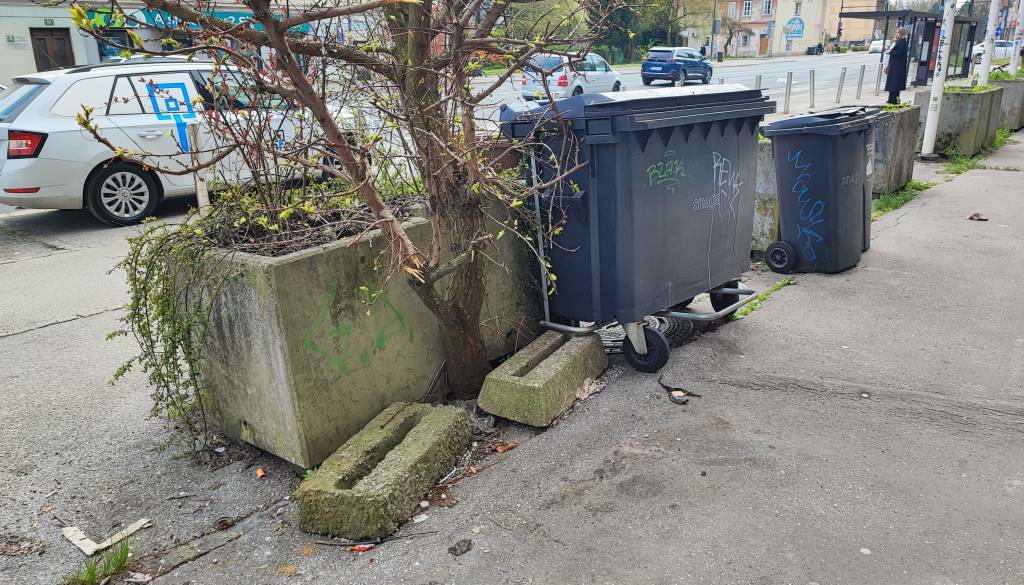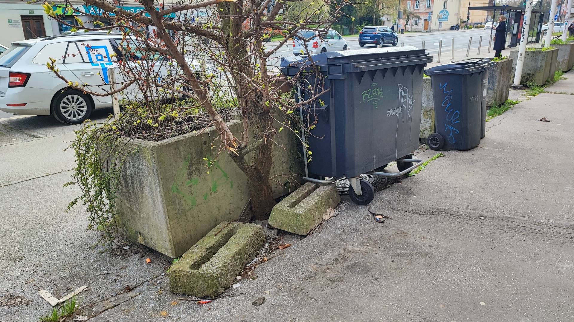 Pred obrtno zbornico in pošto so nekatera betonska korita poškodovana. V njih je zasaditev, ki nujno potrebuje osvežitev, med rastlinjem pa je bolj opazna kopica smeti kot karkoli drugega.