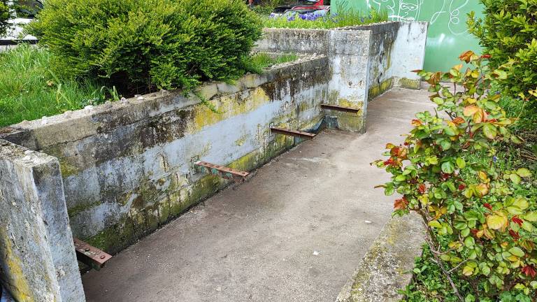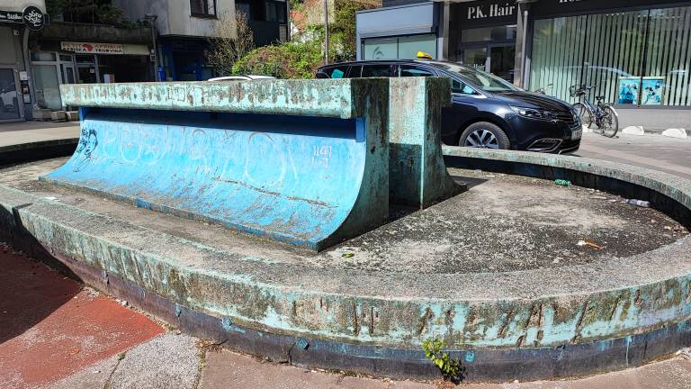 Ko se spustimo na ploščad med omenjenimi bloki in Obrtno-podjetniško zbornico, pa se zgodba spet povsem spremeni. Pridemo do fontane, ki je v razpadajočem stanju.