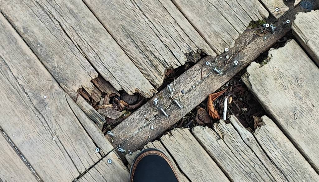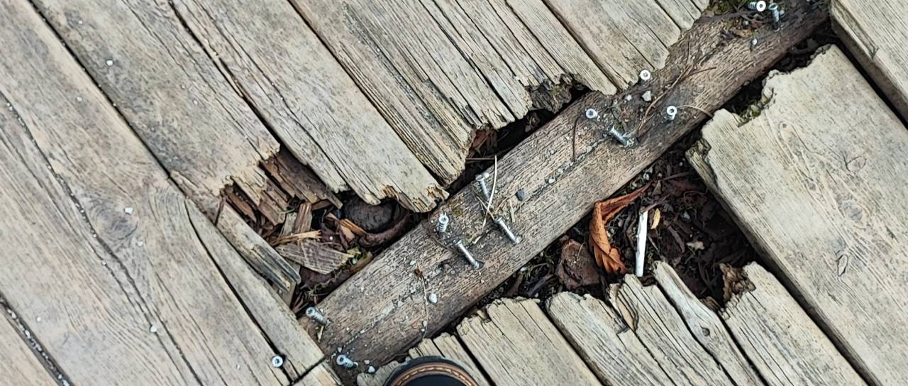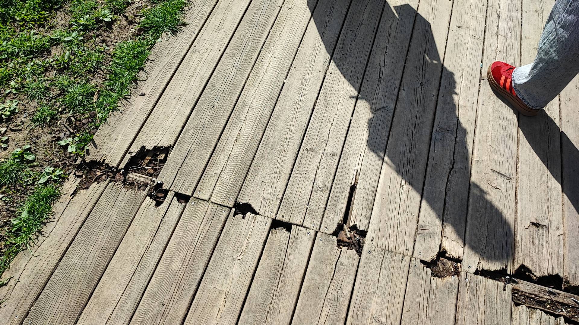 Leseni pod, ki je sicer zasnovan za udobnejši sprehod in počitek v senci dreves, je na več mestih močno poškodovan. Deske so vdrte, ponekod celo preluknjane, iz njih pa štrlijo žeblji, kar predstavlja resno nevarnost za mimoidoče.