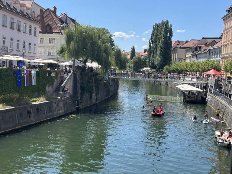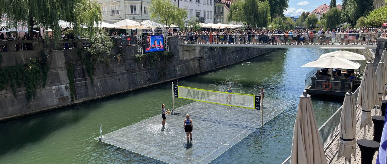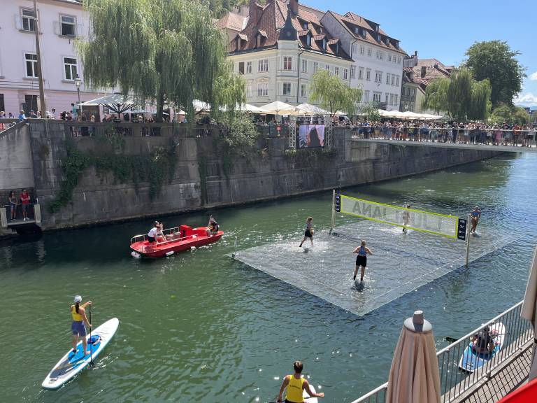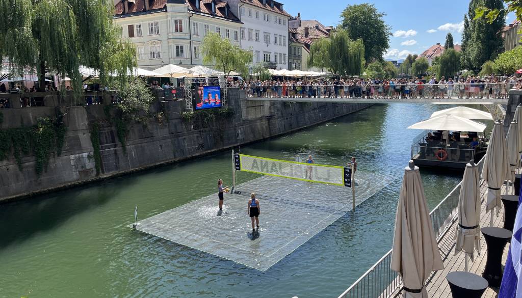 Poglede mimoidočih je danes privabilo igrišče za odbojko, umeščeno kar na sredino Ljubljanice. Za kaj gre?