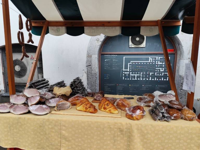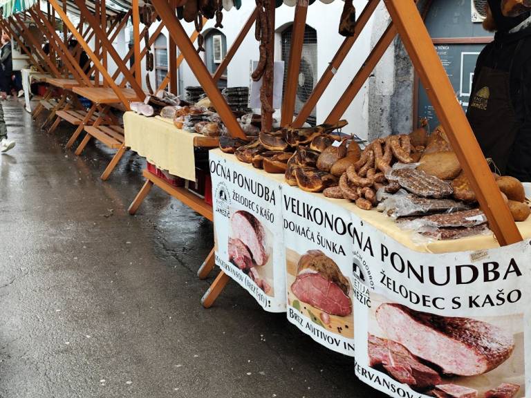 Malce naprej pa so stojnice, kjer ponujajo domače dobrote, kot so domače šunke, klobase in druge izdelke iz mesa. Prodajalka iz kmetije Janežič nam je v videu pokazal ponudbo in povedala cene.