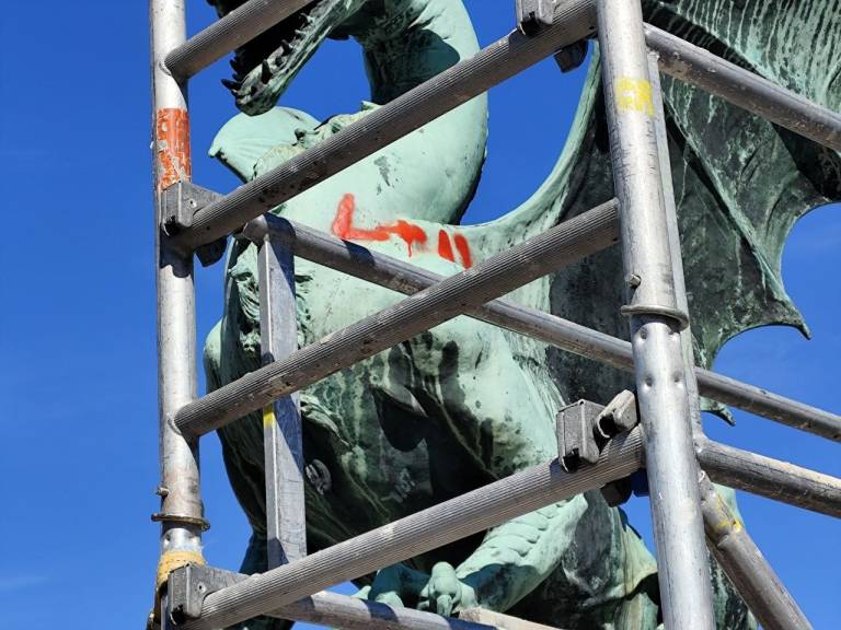 Na znamenitem Zmajskem mostu v Ljubljani so neznanci z rdečo barvo popisali enega od štirih zmajev. Strokovnjaki zdaj ugotavljajo, kako ga varno očistiti.