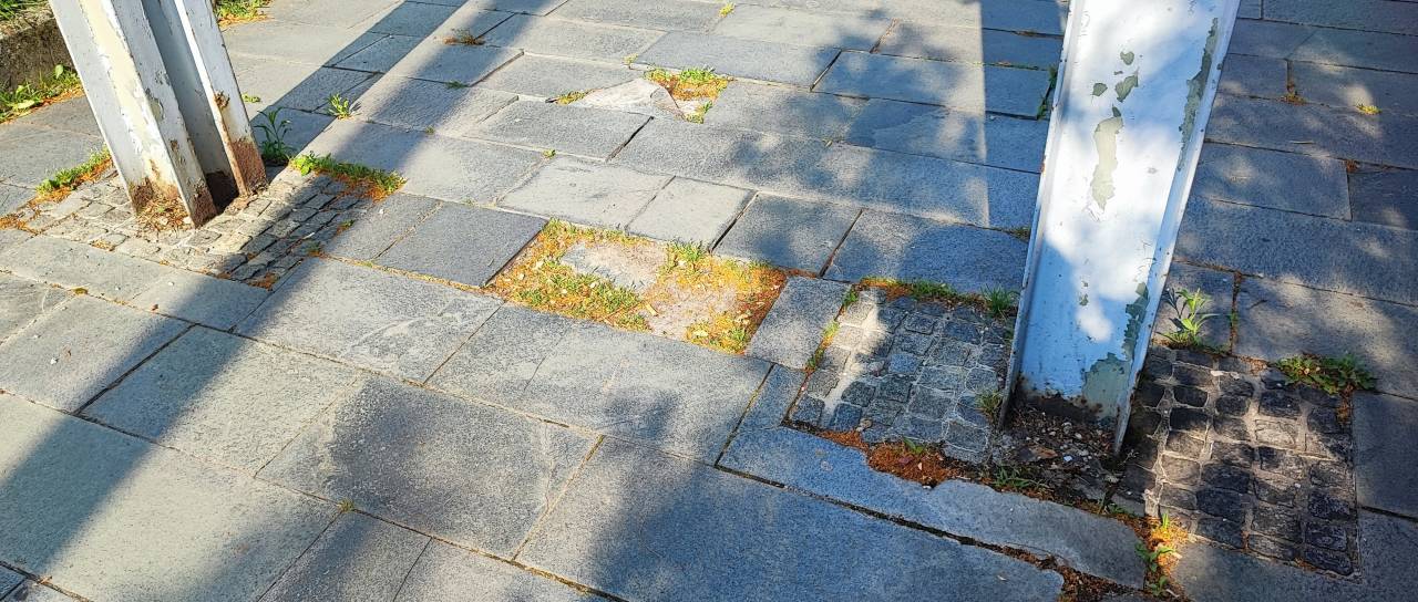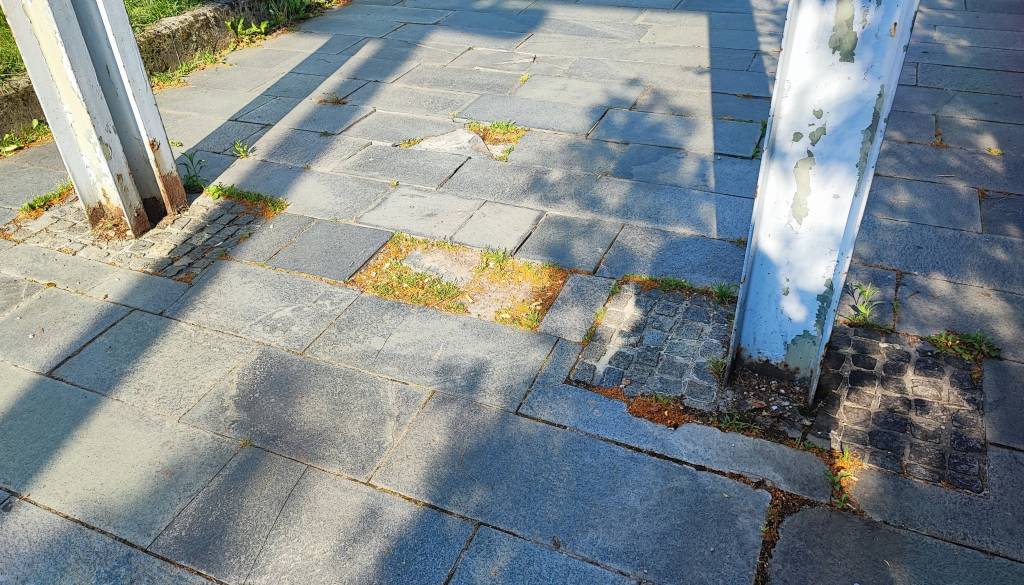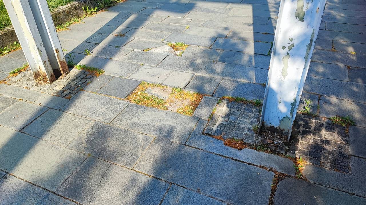 Ta je poškodovana, neravna, pohodne plošče so ponekod razmajane. Tudi železni stebri, ki jo obdajajo, imajo hibe - so rjasti, z njih se lušči barva.