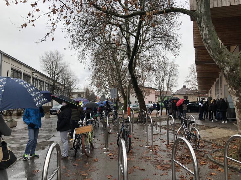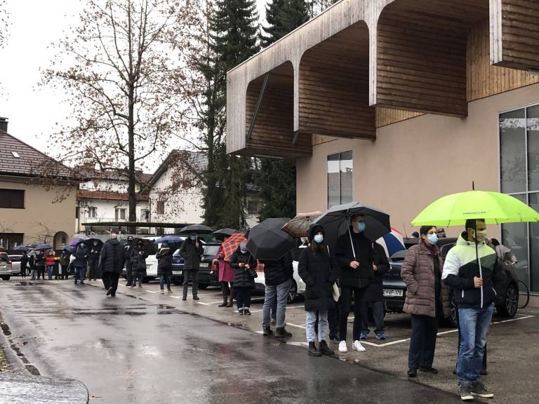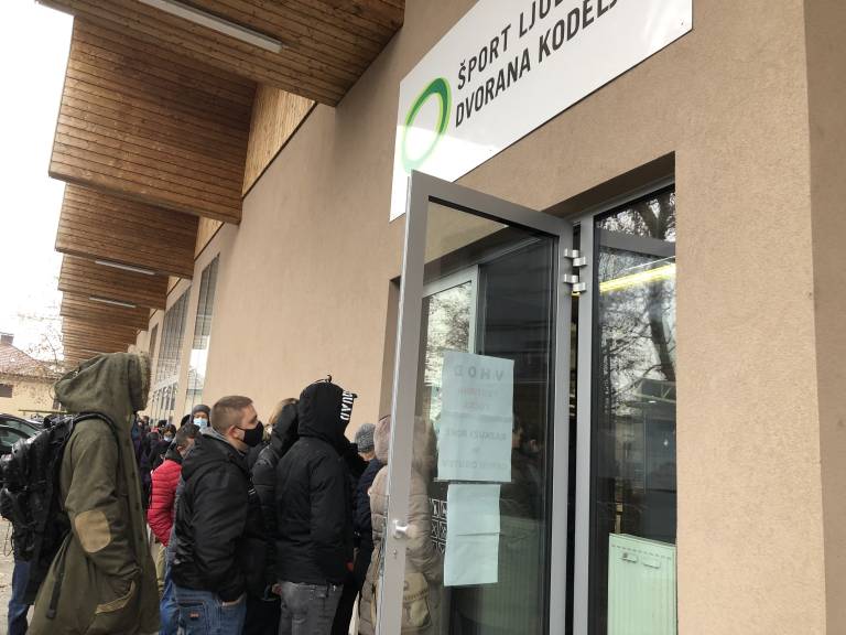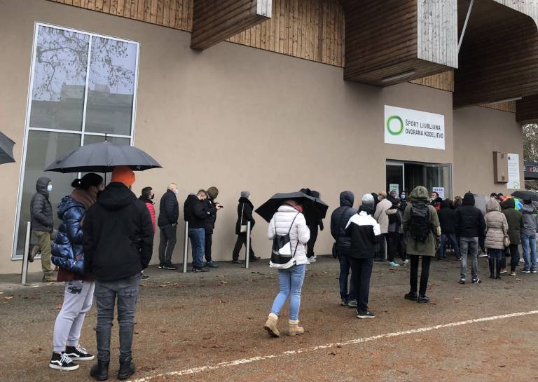 Že pol ure pred začetkom prostovoljnega testiranja, ki poteka med 11. in 15. uro v Športni dvorani Kodeljevo, se je pred vhodom vila dolga vrsta prostovoljcev.