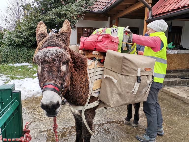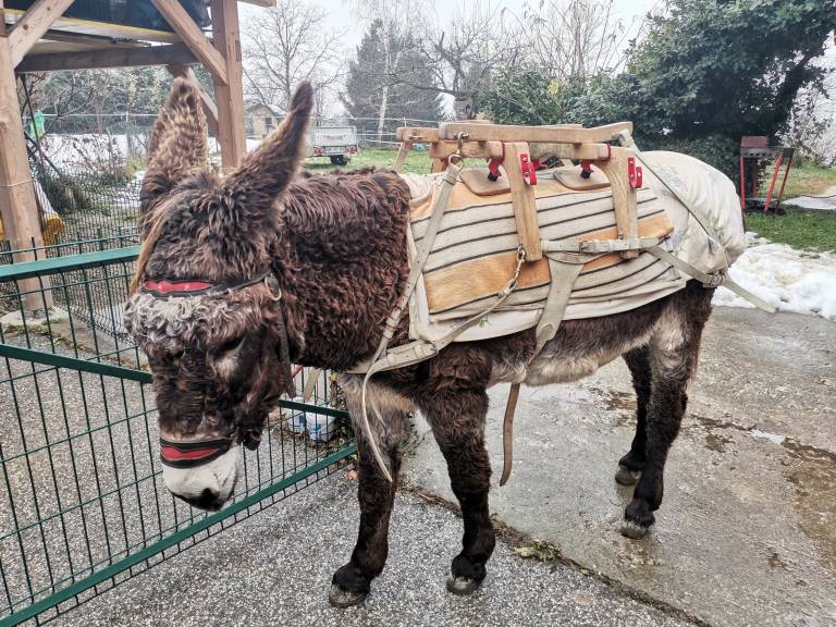 A zakaj na pot prav z oslom? Pove, da so osli mirne živali. Kljub temu da ima konja, je osel bolj primeren za na pot. So umirjeni, pa tudi pojedo veliko manj kot konj.