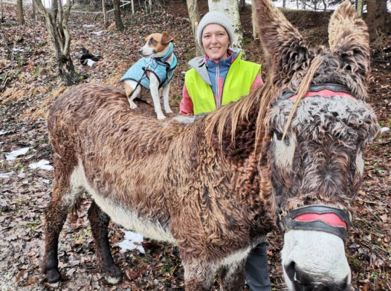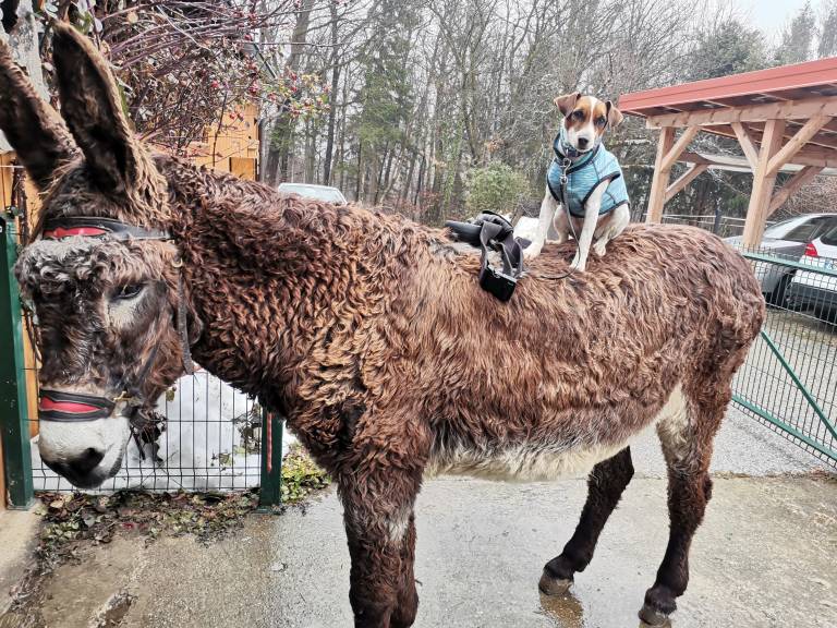 Cindy nadaljuje, da je osel dober čuvaj, saj na poti odganja tudi druge pse, ki bi se preveč približali psički Mini.