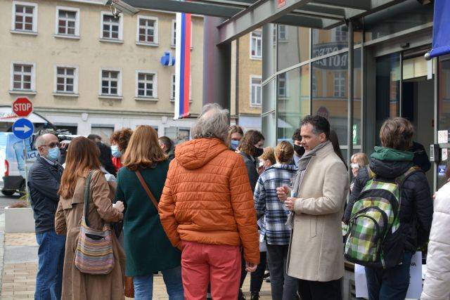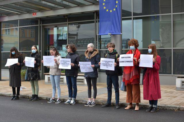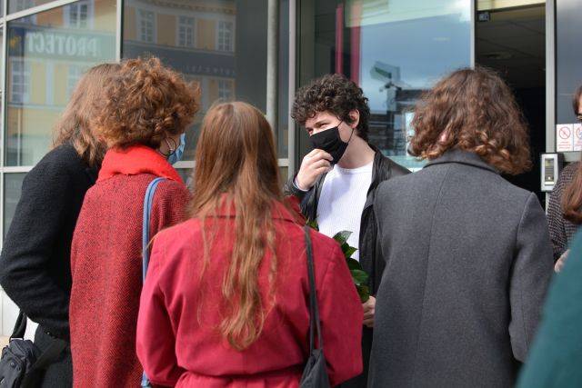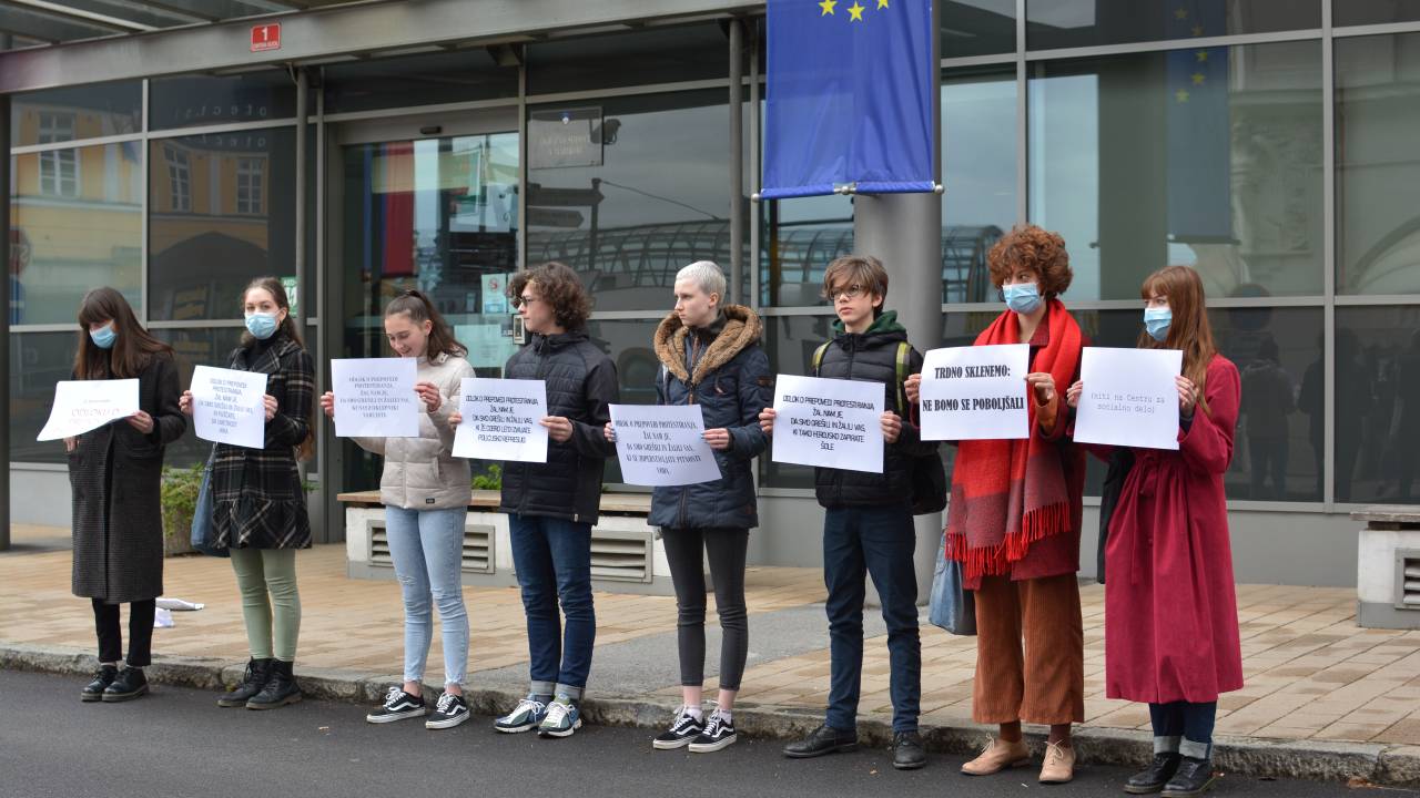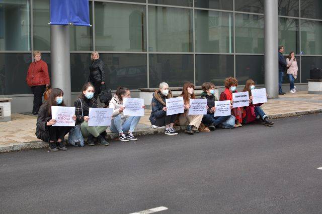 Pred sodiščem se je zbrala skupina dijakov in podpornikov, ki so s transparenti in aplavzom izrazili podporo dijaku Maticu Gosaku. Ta je v začetku februarja sodeloval na shodu na Trgu svobode za vrnitev v šolske klopi.