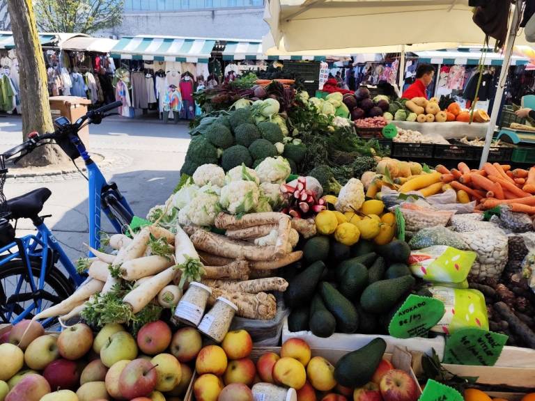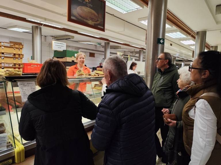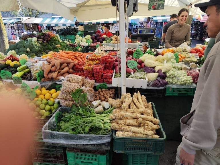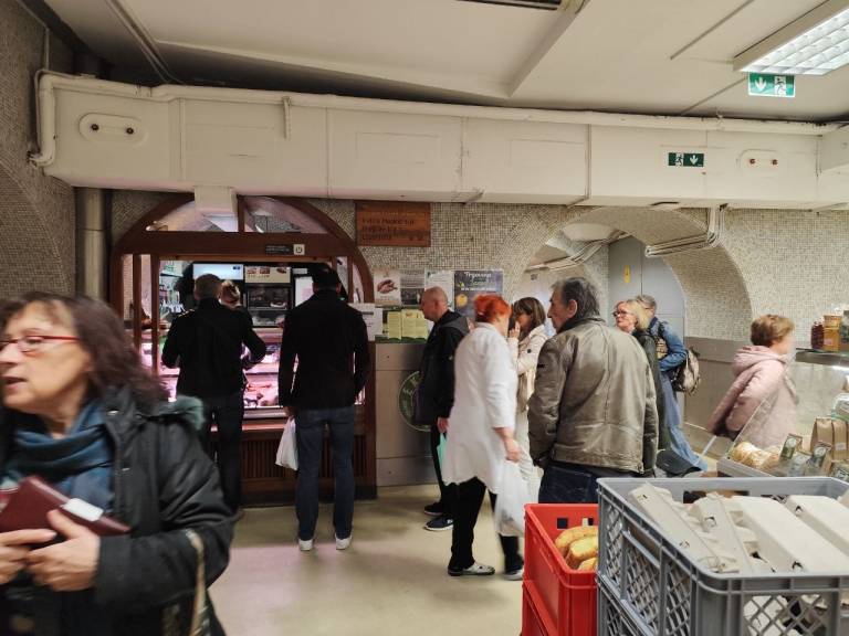 Med stojnicami se vijejo dolge vrste, zrak pa je napolnjen z vonjem po dimljenem mesu, sveže pečenem pecivu in začimbah.