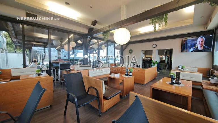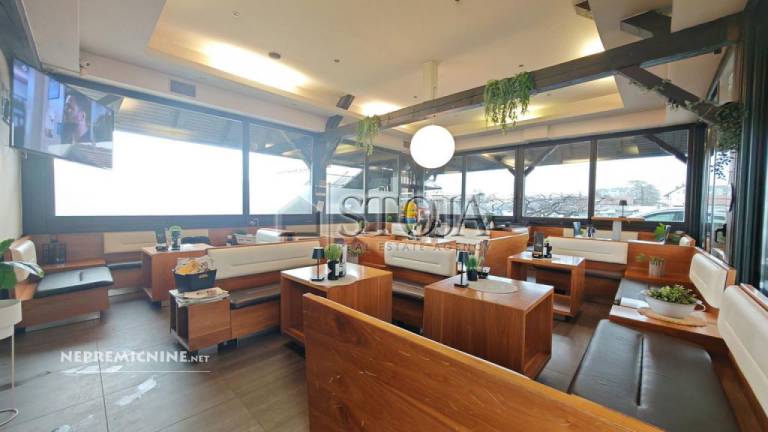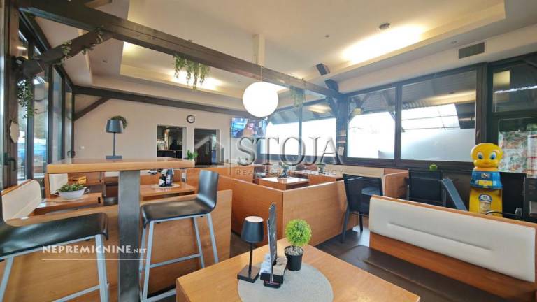 V pritličju so bar z vsemi pripadajočimi aparati, ločene sanitarije za goste, skladišče, garderoba, sanitarije za zaposlene ter pisarna s samostojnim vhodom. V drugem delu so zimski vrt z mizami v izmeri približno 50 kvadratnih metrov ter pokrita terasa z mizami.