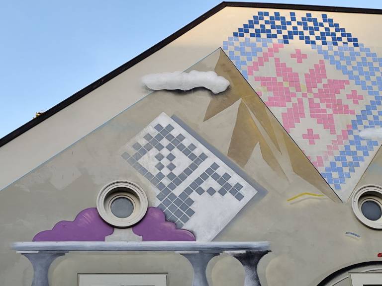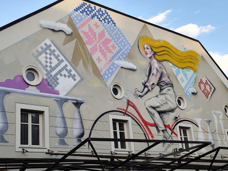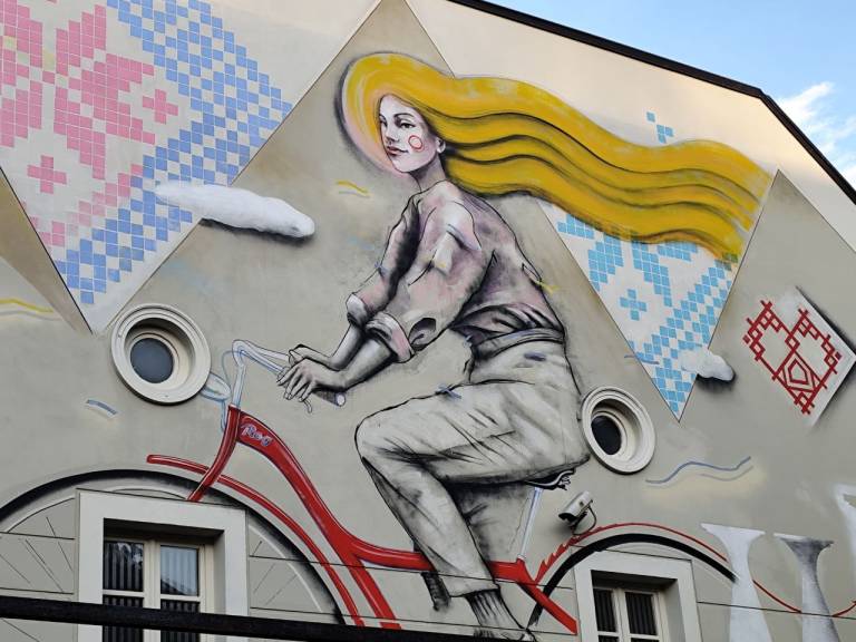 Med oblaki vidimo značilne tradicionalne slovenske vzorce, Plečnikove stebre ter dekle na kolesu. »To je Ljubljančanka,« nam je povedal umetnik.