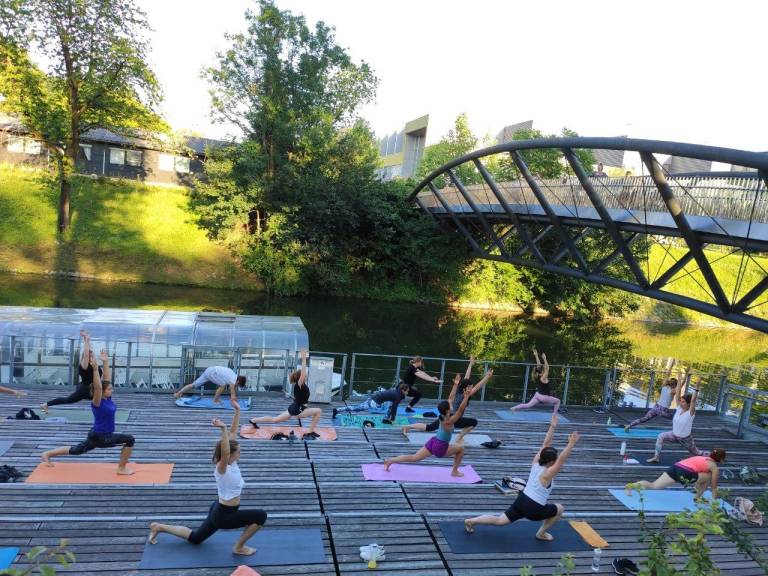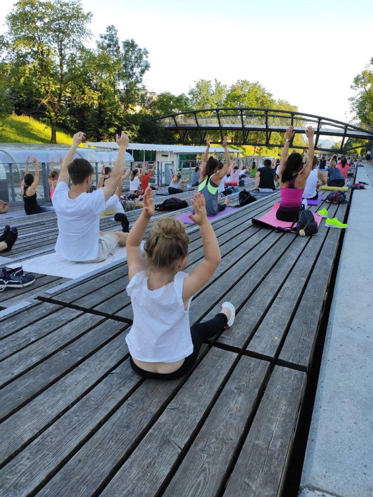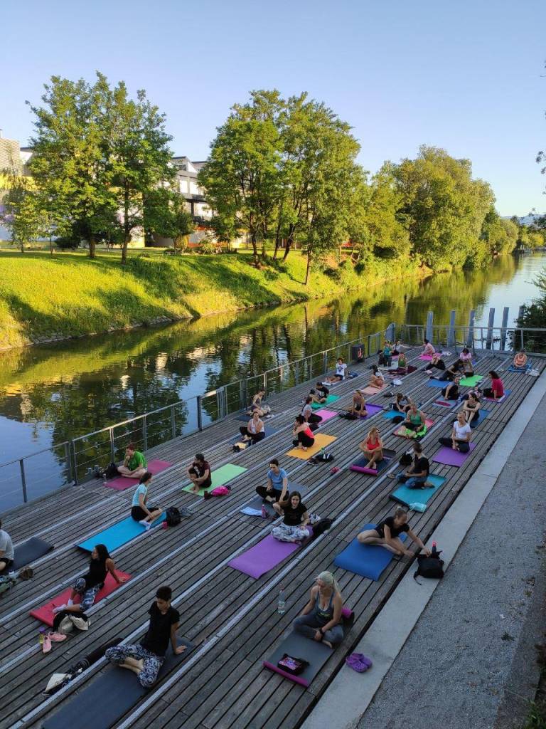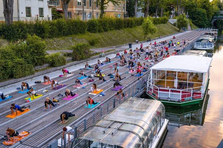 Več kot 150 ljudi, predvsem predstavnic nežnejšega spola, se je zbralo na obrežju Ljubljanice, na prvem poletnem brezplačnem joga večeru.