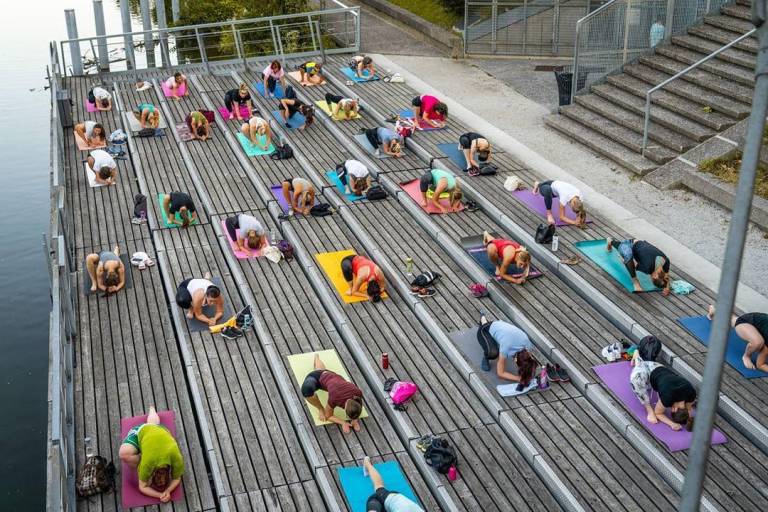 Mlado in staro. Vsak s svojo joga blazino in stekleničko vode. Pristanišče na Špici je bilo tako zasedeno do zadnjega kotička. Na mostu pa so se drenjali opazovalci in pasli svoje oči na raztegajočih se telesih.