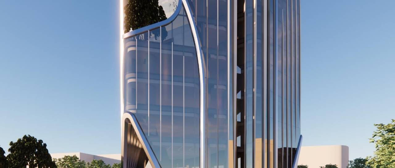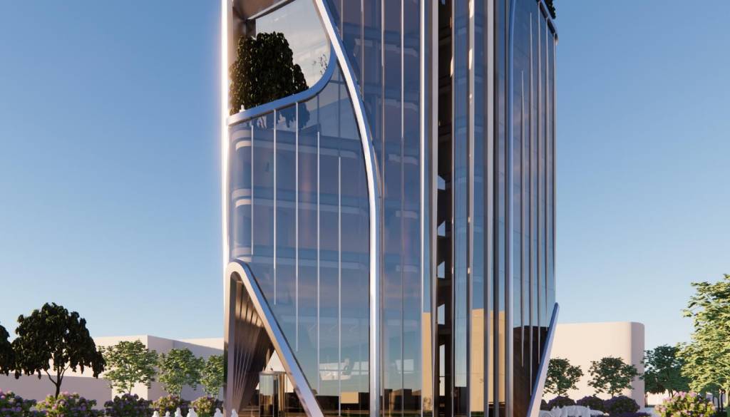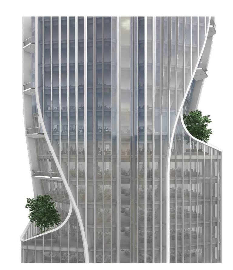 »Stavba je zasnovana kot sodobna vitka stolpnica specifične fluidne oblike. Zunanji gabarit je sestavljen iz treh vertikalnih volumnov, ki so v celoto združeni v osrednjem delu.