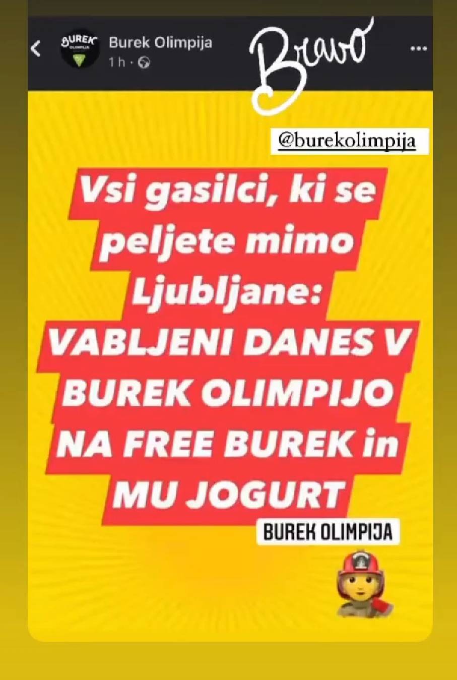 Na svojih družbenih omrežjih so objavili poziv, da so gasilci, ki se proti Krasu vozijo mimo Ljubljane, dobijo brezplačen burek z jogurtom: »Vsi gasilci, ki se peljete mimo Ljubljane: Vabljeni danes v Burek Olimpijo na Free burek in MU jogurt.«