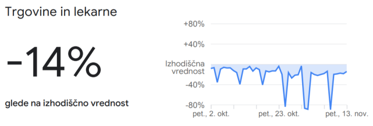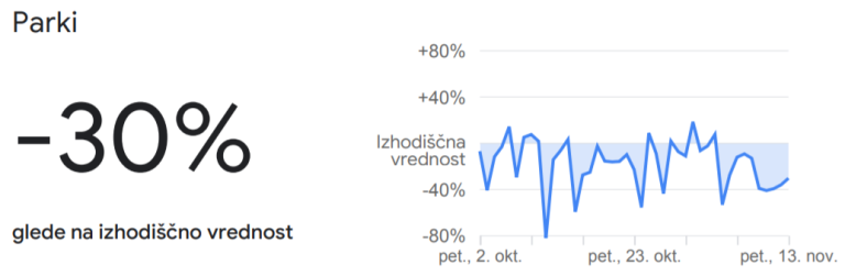 Obisk trgovin z živili, tržnic, drogerij in lekarn se je zmanjšal za 14 odstotkov. Prav tako se je zmanjšalo število prebivalcev, ki hodijo na sprehode v park. V parkih preživijo Ljubljančani 30 odstotkov manj časa, kot pred epidemijo koronavirusa.