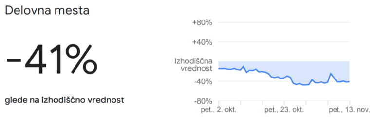Prikazano je, kako so se spreminjali trendi gibanja prebivalstva v šestih kategorijah: prostočasne aktivnosti, trgovine in lekarne, parki, postaje javnega prevoza, delovna mesta in stanovanjske soseske.