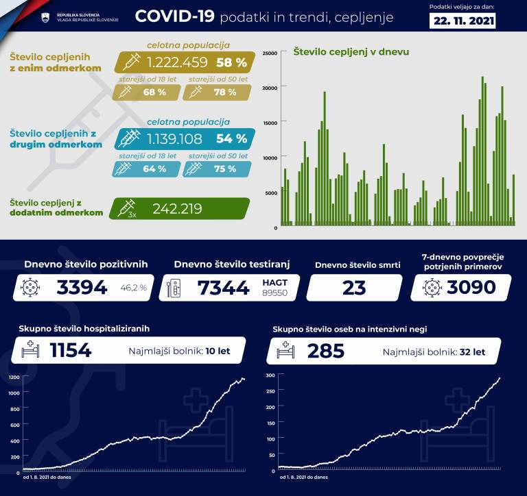 V Sloveniji so včeraj, 22. novembra, opravili 7344 PCR testiranj na koronavirus in potrdili 3394 novih okužb, gre za 46,2-odstotni delež okužb.