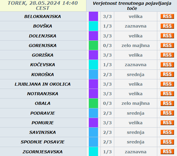 Trenutna napoved Agencije RS za okolje kaže, da Ljubljani in okolici preti velika verjetnost toče. Podobno slabo se piše tudi Pomurju ter Beli krajini, Dolenjski, Goriški in Notranjski, ki so prav tako obarvane vijoličasto.